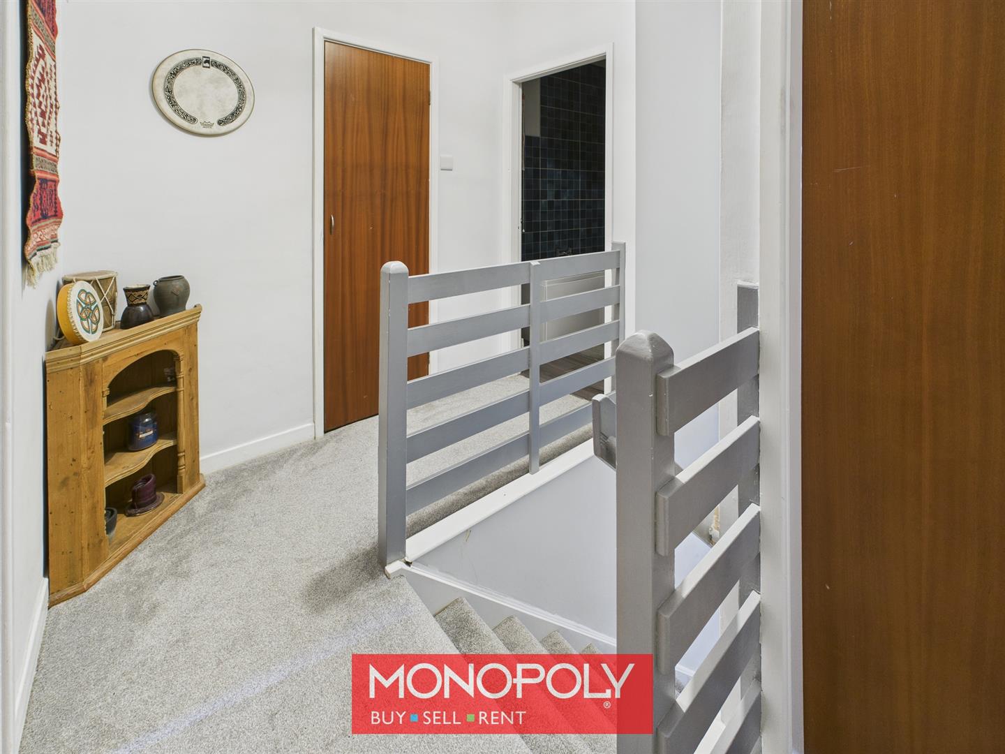 Upstairs, the carpeted landing provides access to all bedrooms and the bathroom, along with a large airing cupboard housing the boiler. The bannisters and handrail are painted in keeping with the home’s neutral decor.