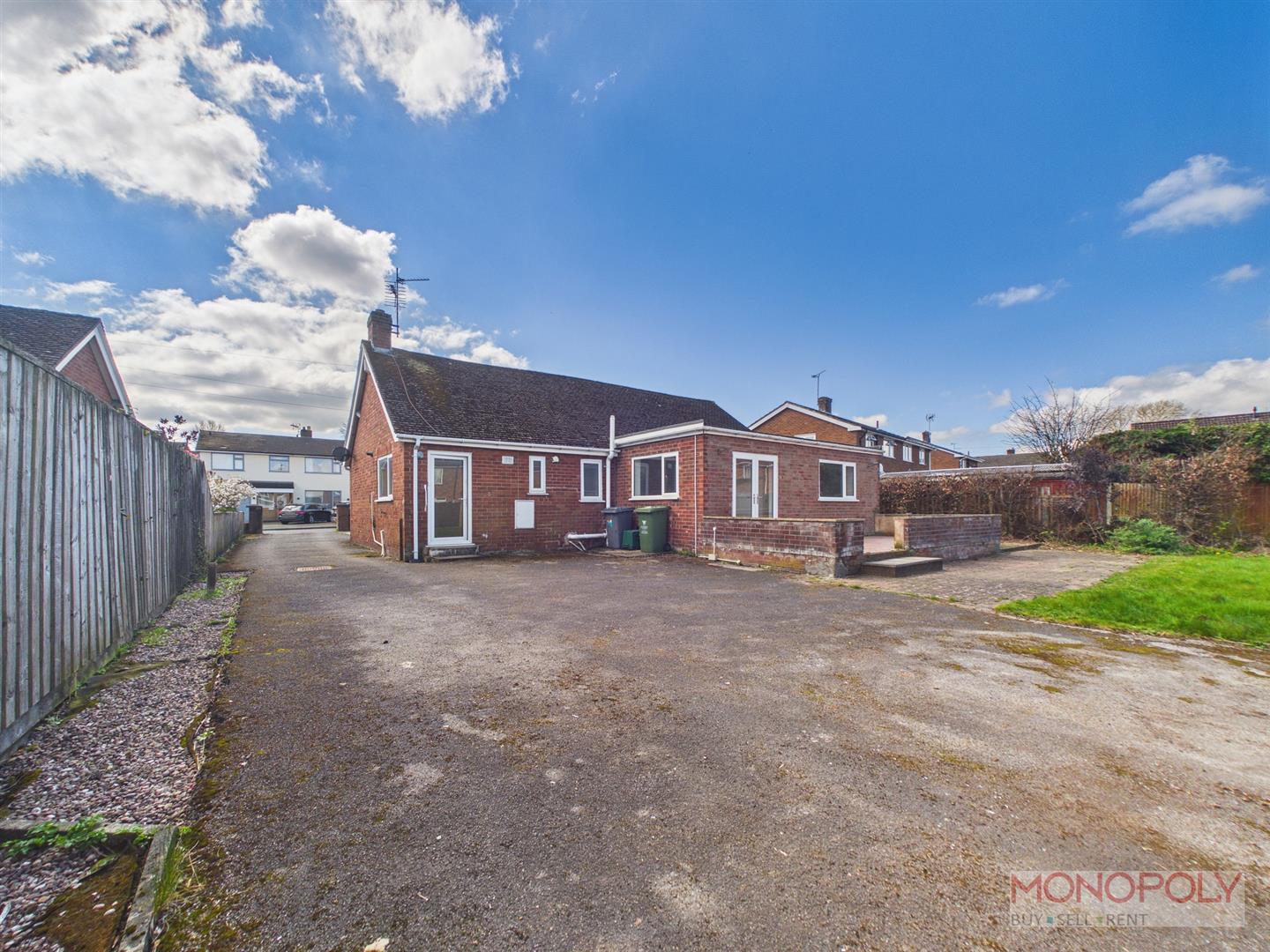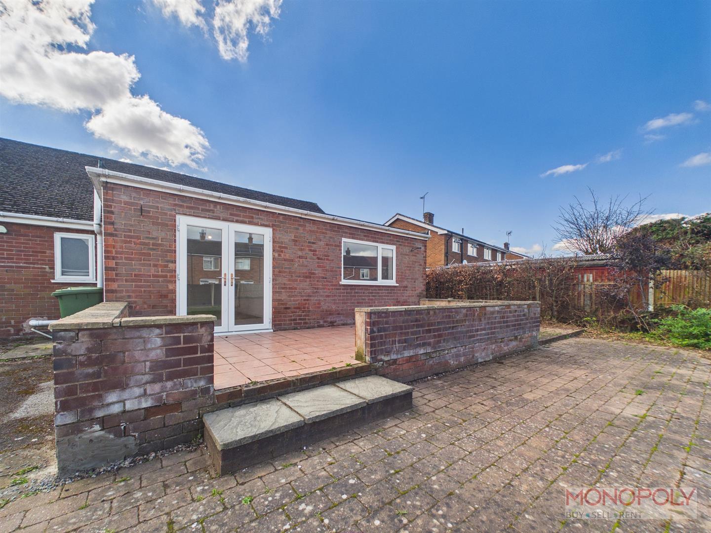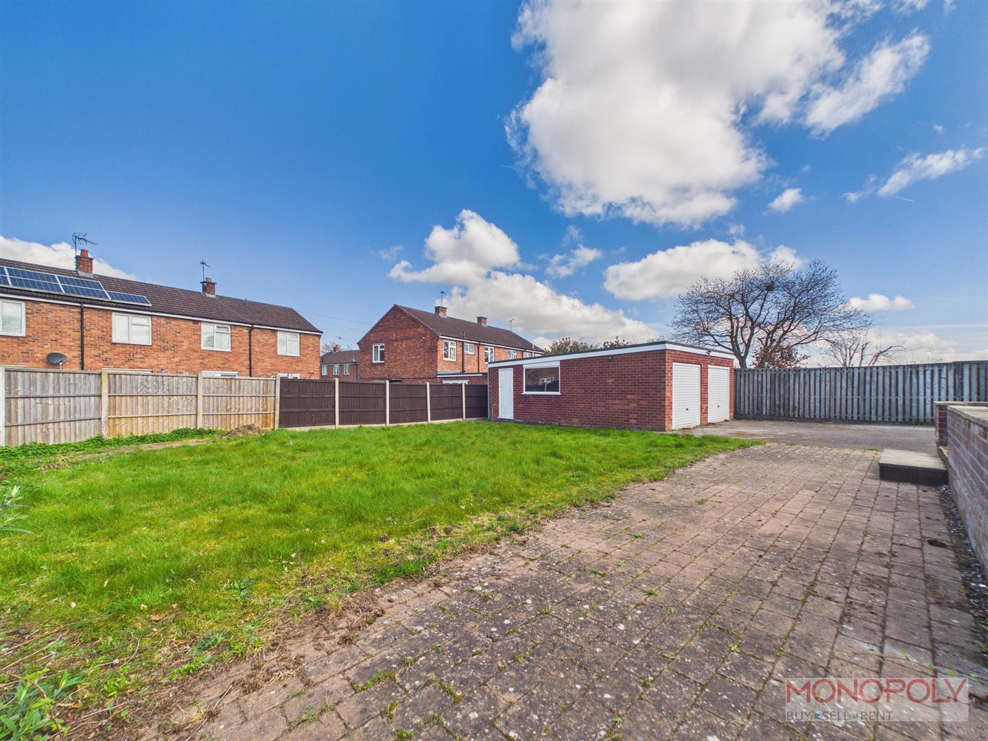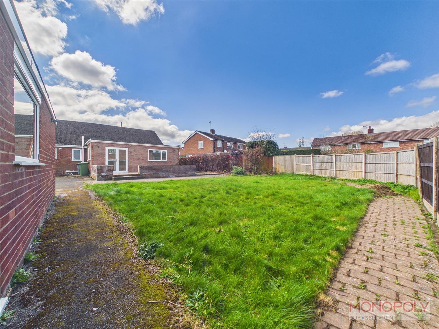 Rear - Patio adjacent the rear of the house, brick paving, lawn, fencing to side and rear.