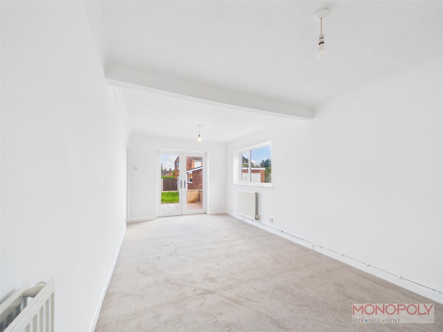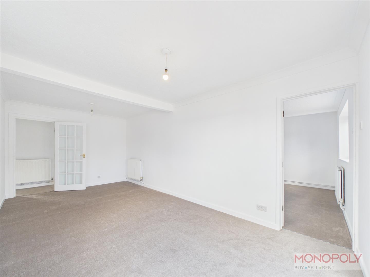 Carpet, window to side, French style doors to rear, door to bedroom three.
