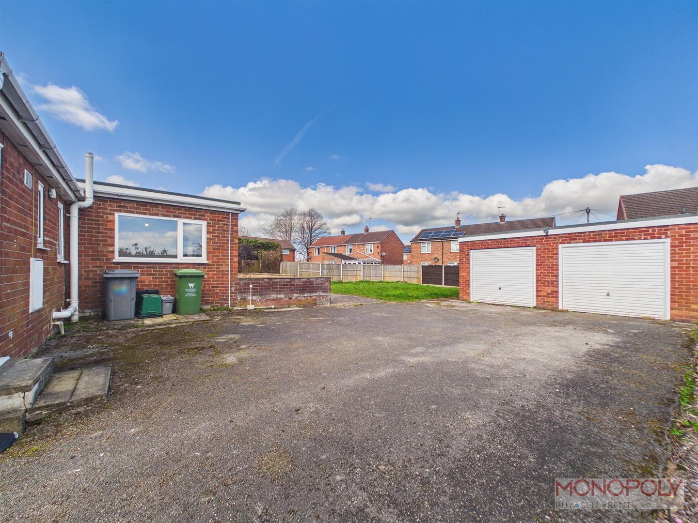Double garage with two up and over vehicle doors, pedestrian door to rear.