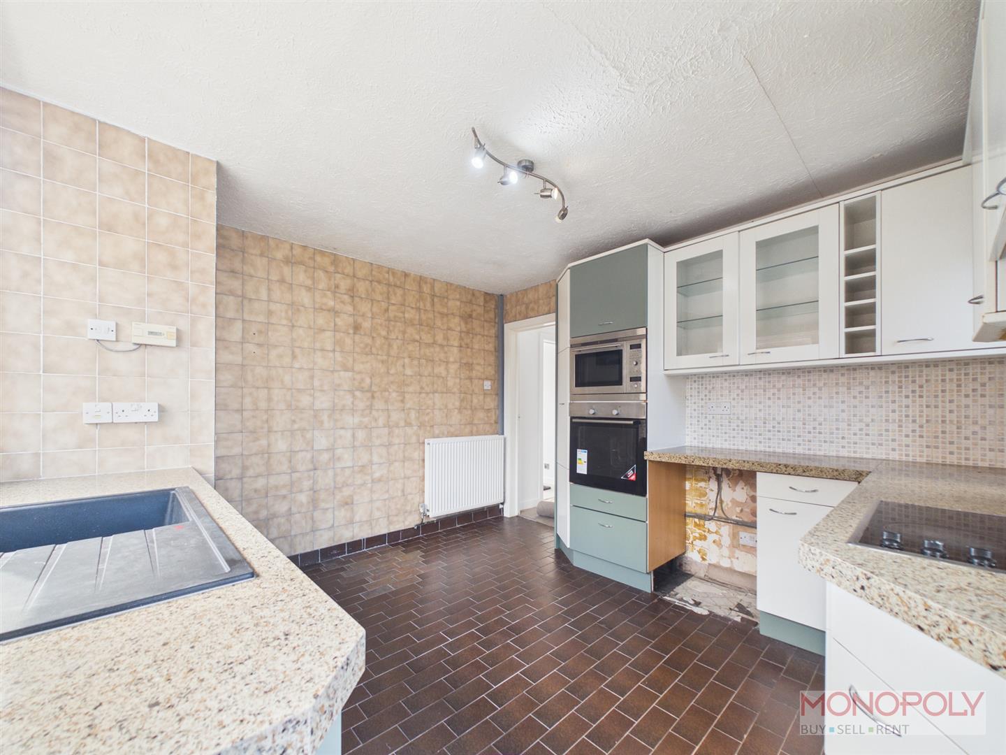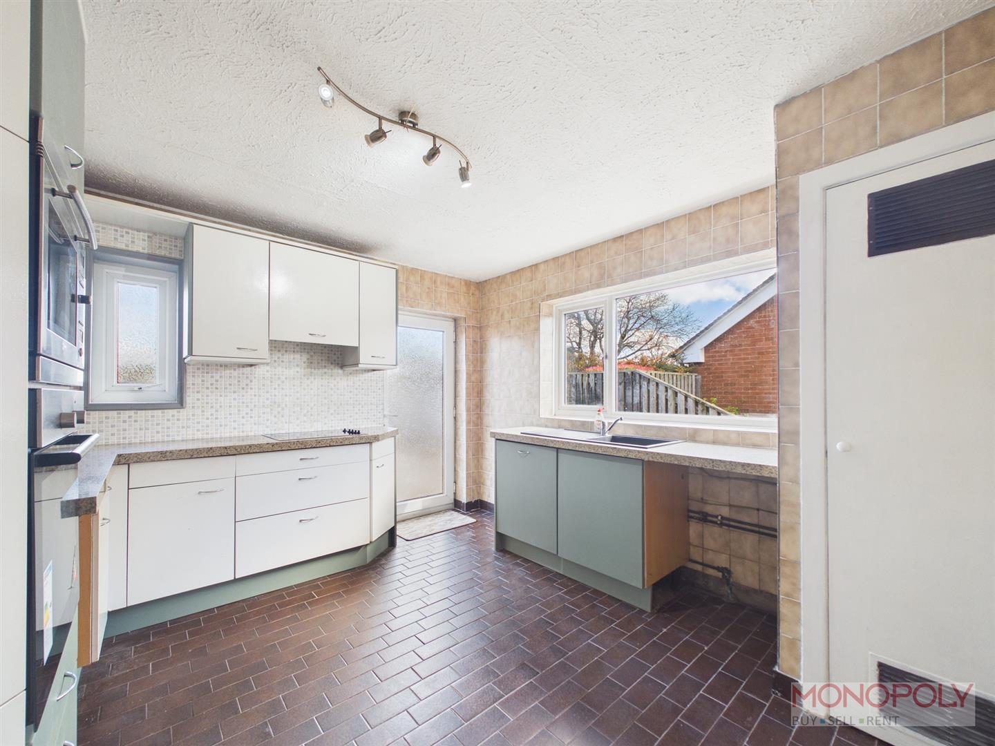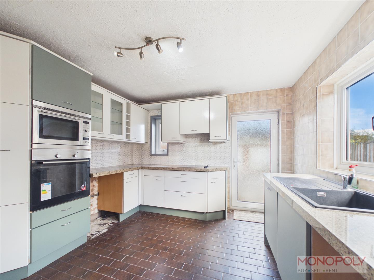 Fitted range of wall and base units, complementary worktops, inset composite sink drainer with mixer tap, single oven, microwave, electric hob with extractor over mosaic tiled splashback, windows to rear and side, glazed upvc door to rear, tiled flooring, built in storage cupboard.