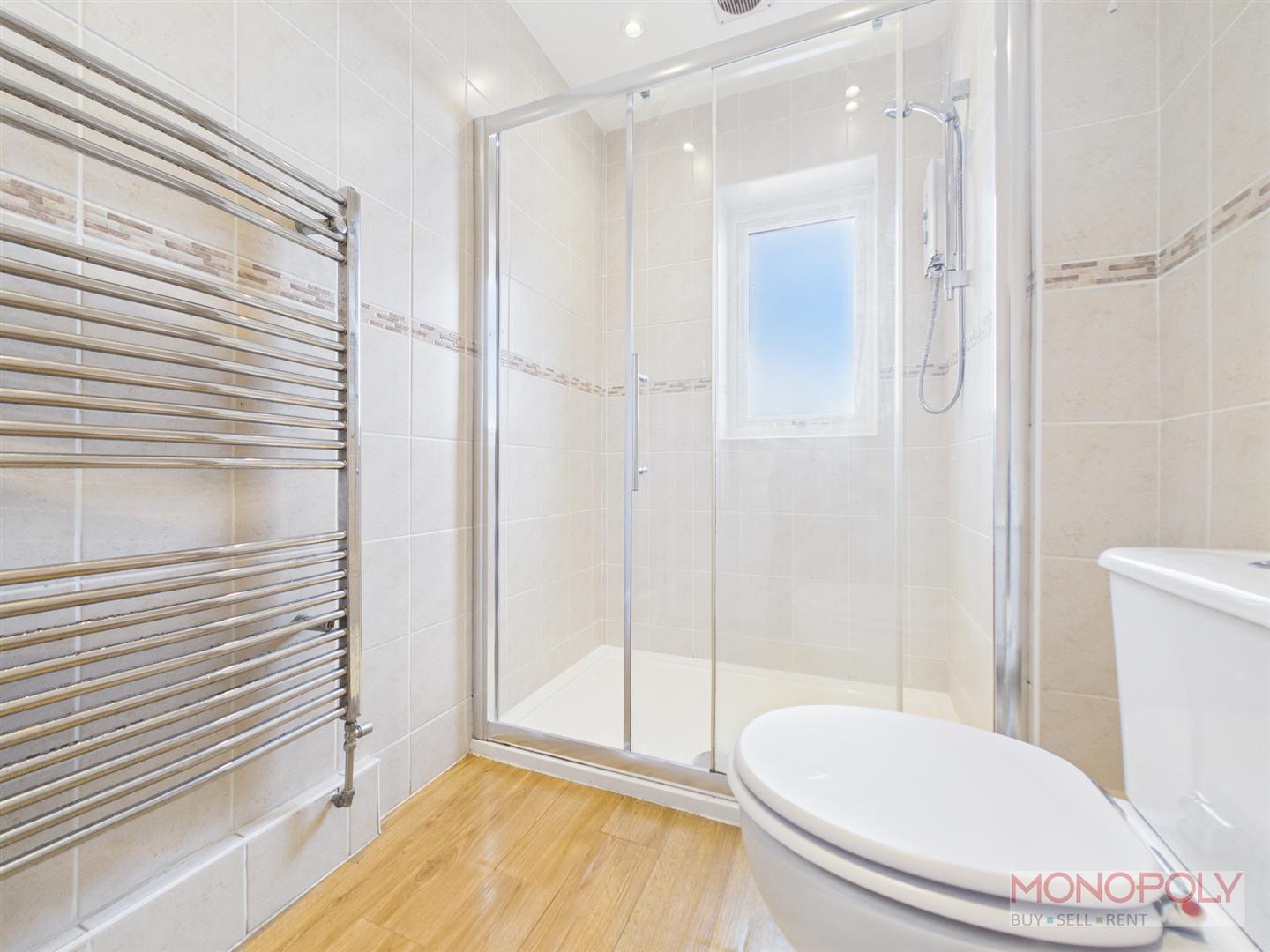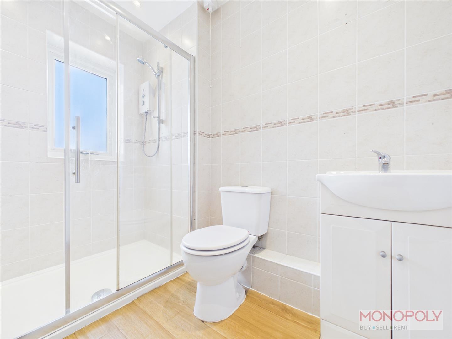 Walk in shower enclosure, window to rear, wc, hand wash basin set in a vanity unit, laminate flooring, chrome towel rail.