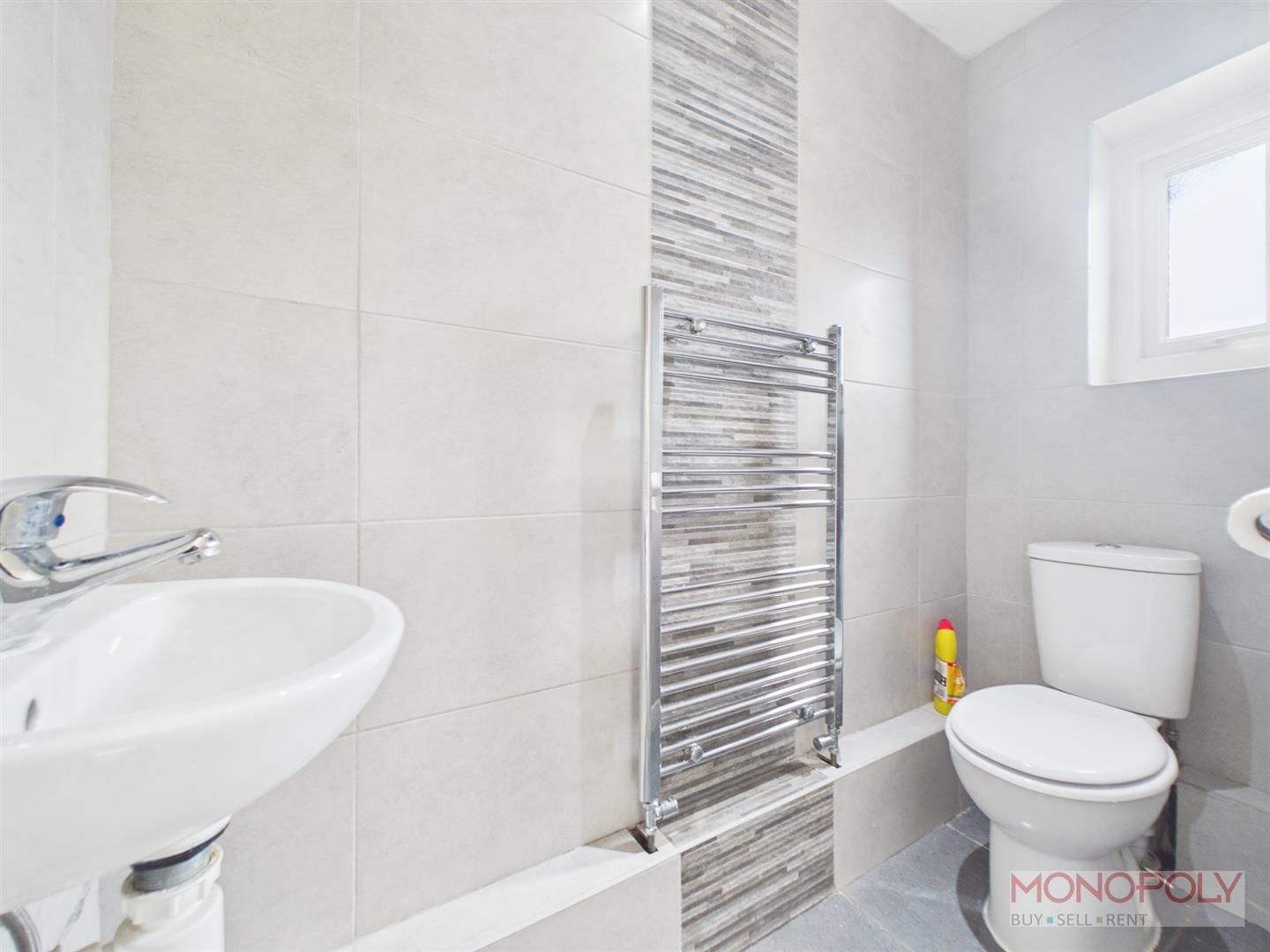 Low level WC, hand wash basin, chrome towel rail, tiled walls and floor, window to front.
