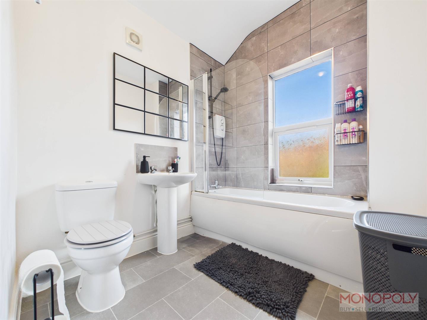Three piece suite comprising low-level WC, pedestal wash hand basin and panelled bath with electric shower over. Extractor fan, ceiling light point, vinyl flooring, part tiled walls, storage cupboard with shelving and uPVC double glazed frosted window to the rear.