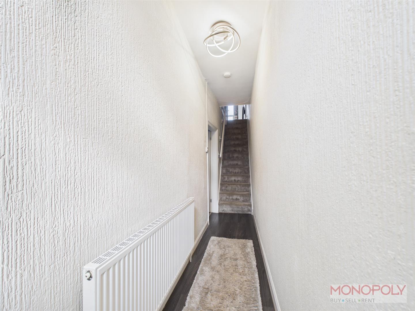 UPVC double glazed door leading into entrance hall. Wooden laminate flooring, ceiling light point, panelled radiator, stairs to first floor and door into dining/lounge.