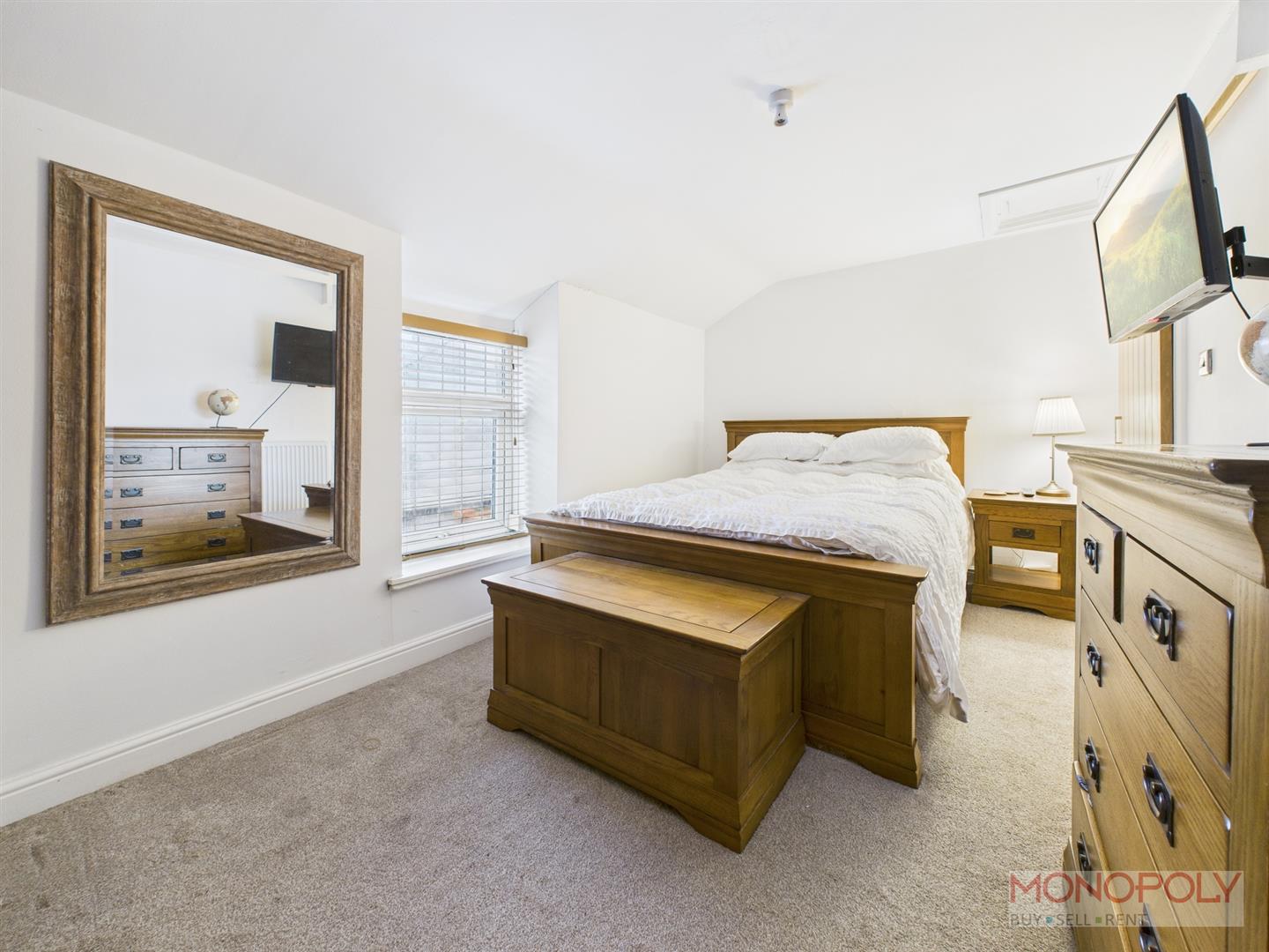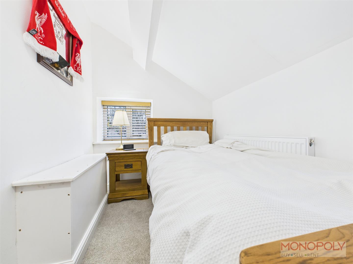 UPVC double glazed leaded window to the front elevation with venetian blinds. Carpet flooring, panelled radiator, access to loft and ceiling light point. Sliding oak door leading to WC.