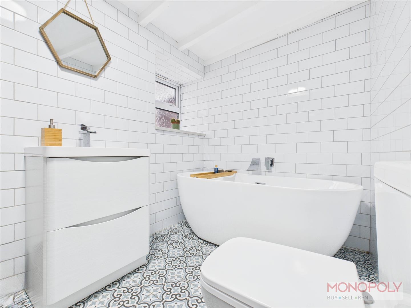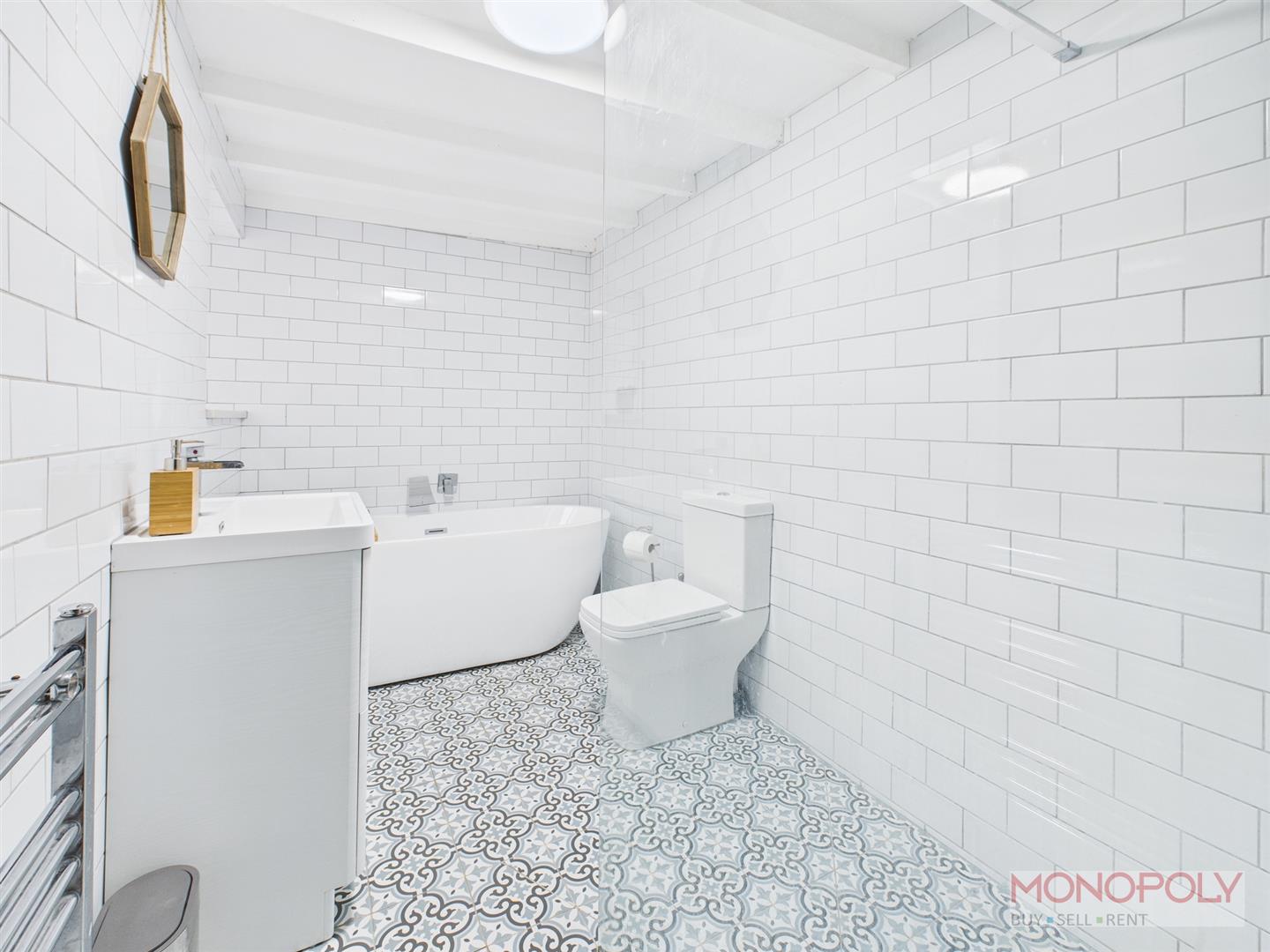 Renovated and modern four-piece bathroom suite comprising a low-level WC, wash hand basin set on storage drawers, freestanding bath with waterfall mixer tap and double walk-in dual hose mains shower with glass screen and inset tiled shelving. Built-in marble shelving, chrome heated towel rail, under-floor heating, brick-style tiled walls, patterned tiled flooring, ceiling light point, beamed ceiling, uPVC double glazed frosted window to the rear elevation with marble sill.