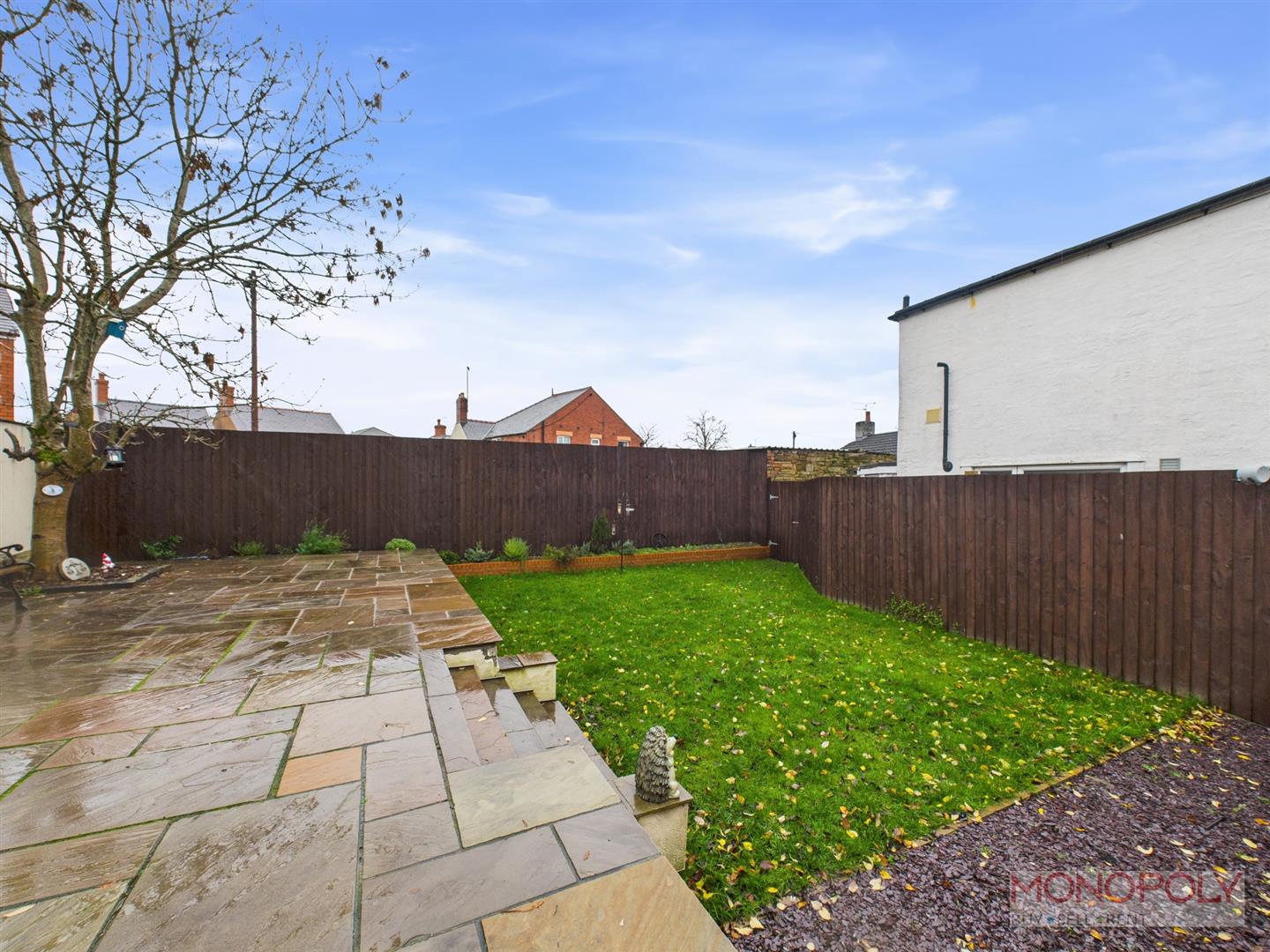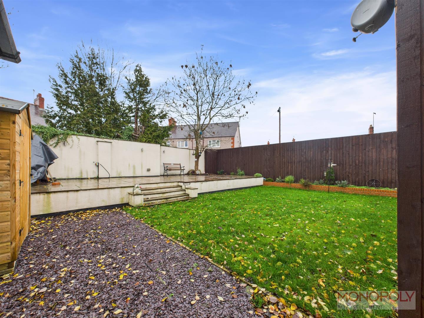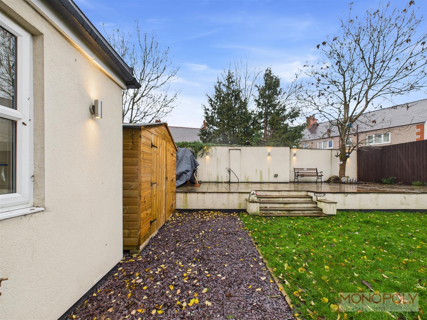 To the front of the property is a tarmacadam driveway providing parking for two vehicles, enclosed by low boundary walls and wrought iron gates, including a separate pedestrian gate. Steps lead down to a sheltered entrance porch, with external lighting for convenience. A side pathway with a timber gate gives access to the rear. The rear garden is generous in size and has been thoughtfully landscaped to create an attractive and low-maintenance outdoor space. It features a slate-chipped seating area, a central lawn, and steps rising to a spacious upper terrace laid with Indian sandstone paving—perfect for entertaining. The garden also benefits from mature planting including an established tree, raised borders, wall and fenced boundaries for privacy and security, up-and-down external lighting, and an outside tap. There are also multiple storage options, including a timber shed and an aluminium garden store, both available by separate negotiation.