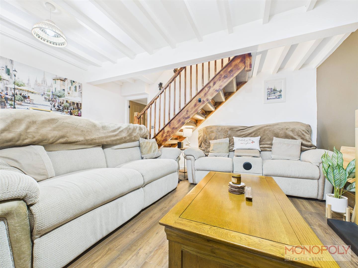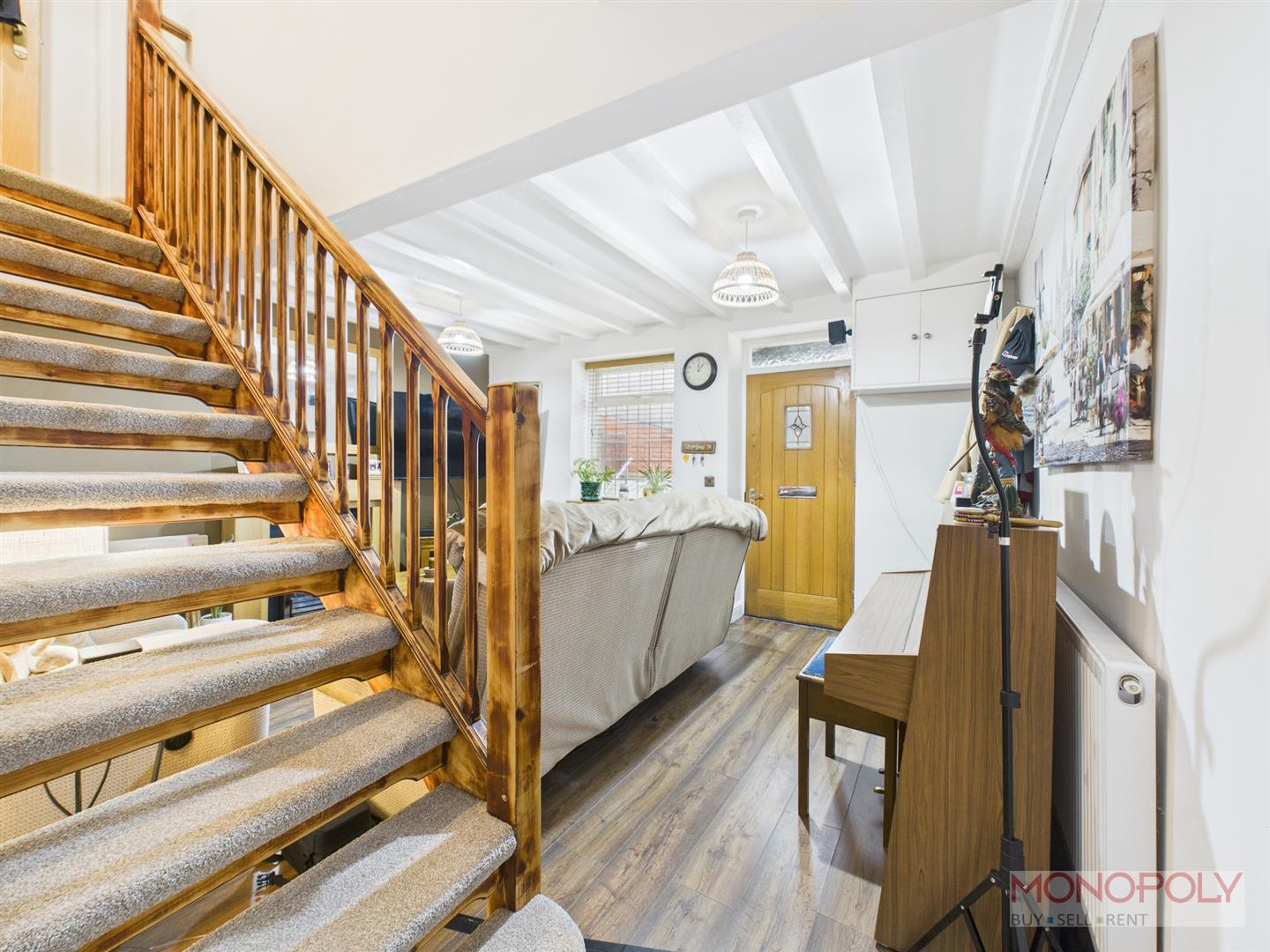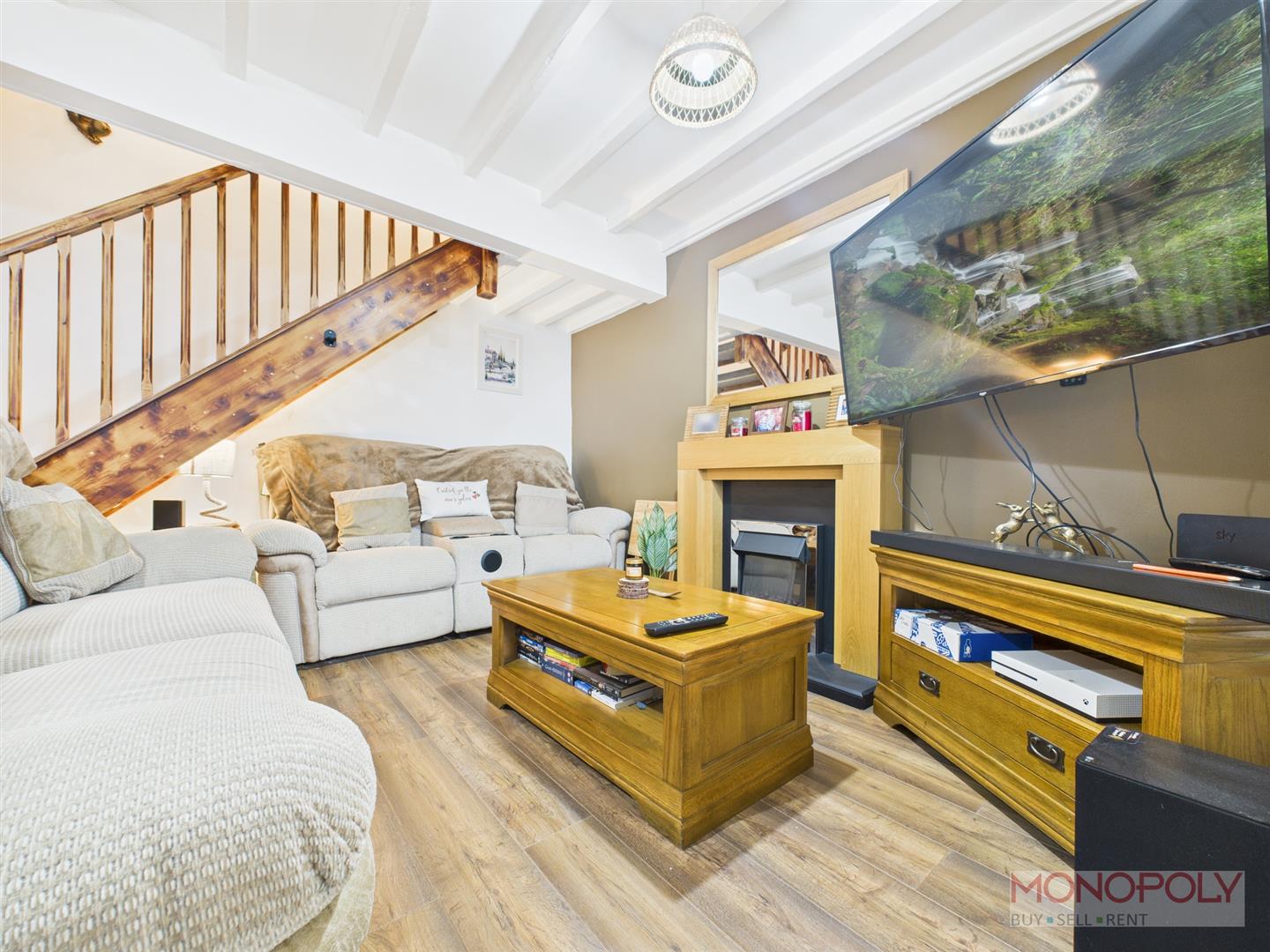 Hardwood door with leaded window leads in the living room with uPVC double glazed leaded window to the front elevation with venetian blinds and wooden sill. Electric fireplace with wooden surround. Beamed ceiling, wooden laminate flooring, two ceiling light points, panelled radiator, cupboard housing electric box and meter, open tread carpeted stairs leading to first floor and engineered oak door leading to inner hallway.