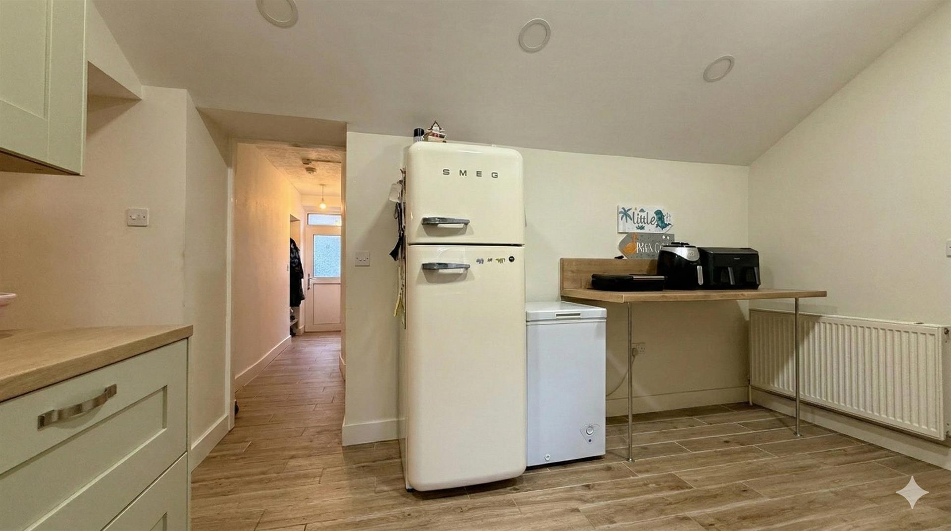 A spacious contemporary kitchen with a range of wall and base units, tiled splash backs, breakfast bar and porcelain tiled flooring. There is a built in oven with gas hob and extractor over, space for fridge freezer and free standing appliances and window to the rear.