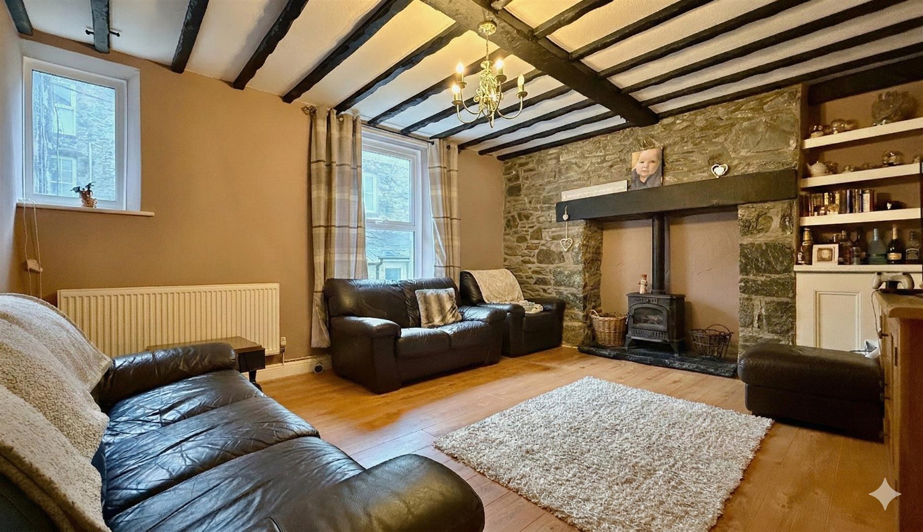 Very attractive spacious room full of character with beamed ceiling, traditional stone fireplace with stove effect gas fire, window to the side and wood effect laminate flooring. A door leads to the lower ground floor accommodation.