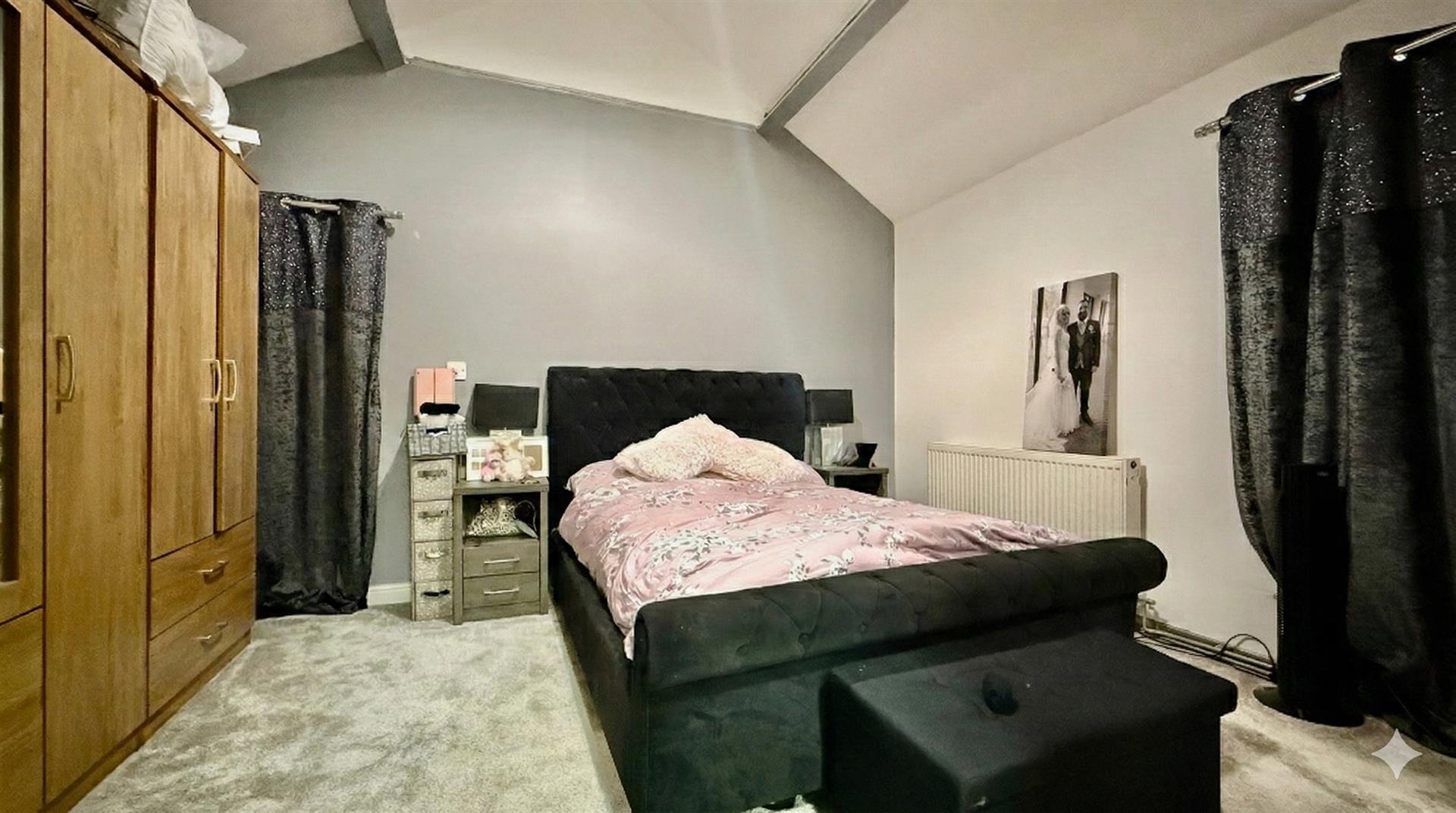 A large double with dual aspect windows, a private external door and door to en-suite. A characterful room with high vaulted ceiling and painted ceiling beams.