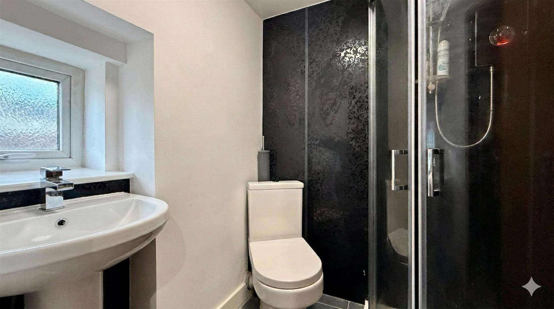 Well appointed with tiled floor, shower cubicle, low level WC, hand basin, heated towel rail and obscure window.