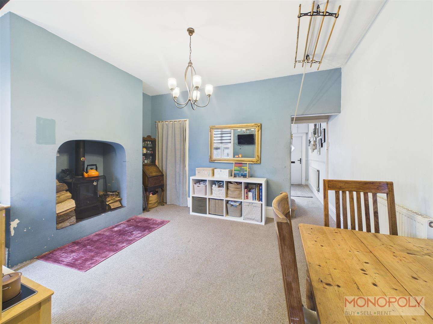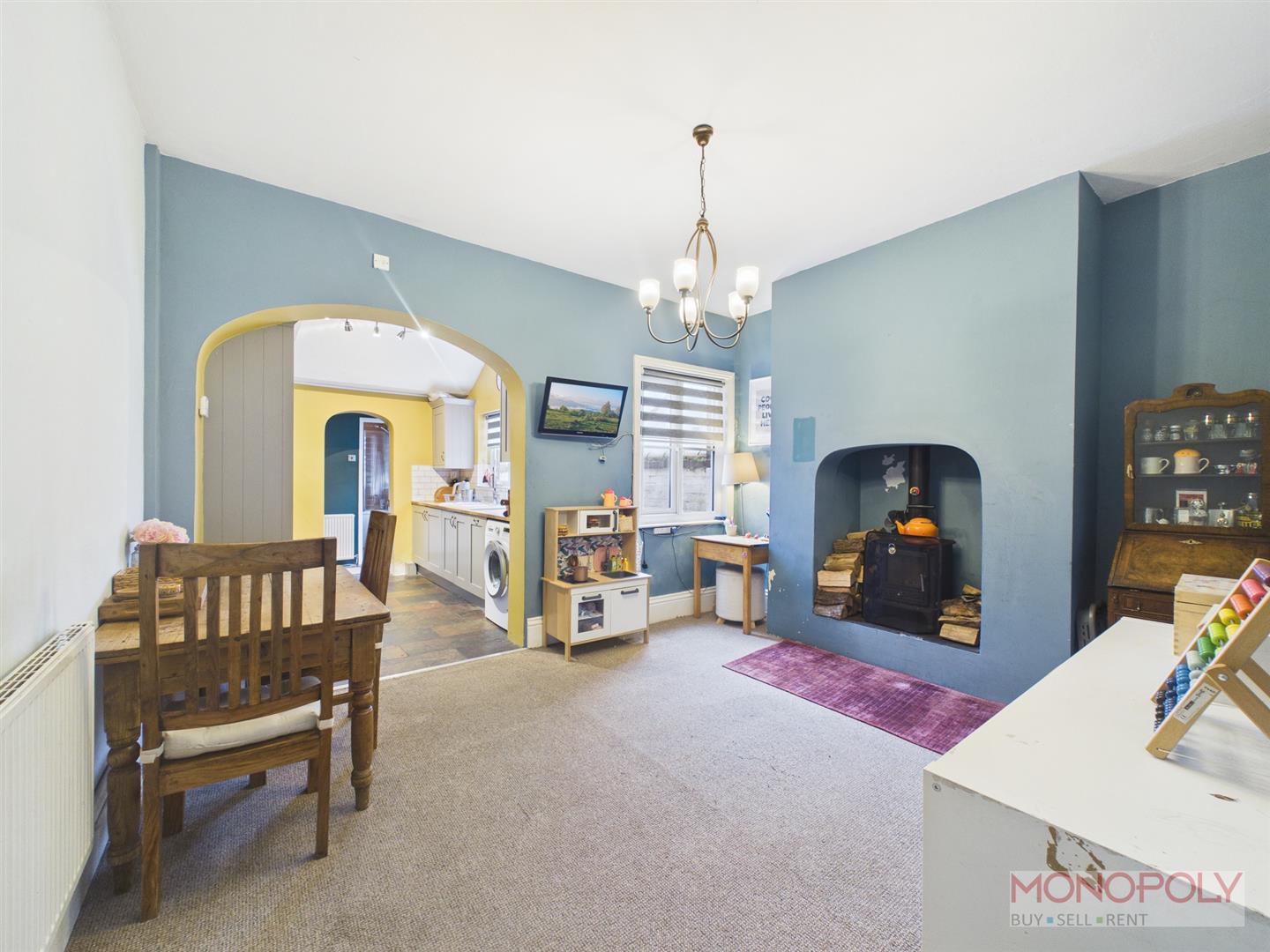Window to rear, understairs storage alcove, wood burning stove, carpet, open plan to kitchen.