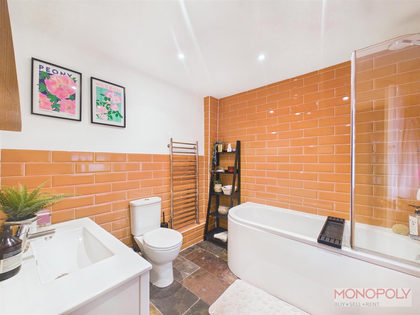 Panel bath with shower over, shower screen, wc, hand wash basin set in a vanity unit, tiled splashback, slate tiled floor. Spotlights to ceiling, frosted window to side.