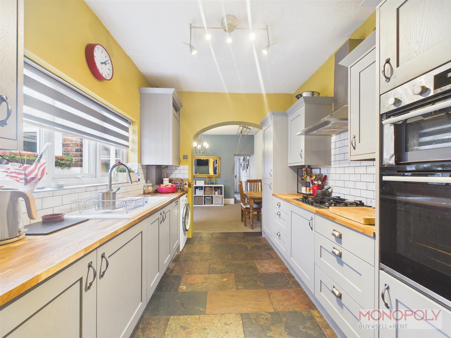 Fitted range of wall and base units, timber work tops, ceramic sink drainer with mixer tap over, gas hob, extractor over, oven and grill, tiled splash back, window to side, wall mounted gas combi boiler, open plan into rear hall. Tiled floor.