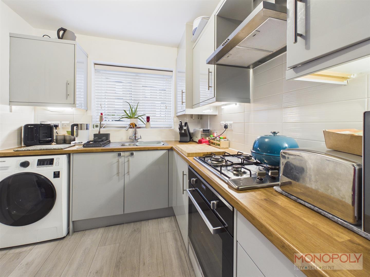 Housing a range of wall, draw, and base units with complementary worksurface over. Integrated appliances to include electric fan oven, gas hob and extractor hood over. Space for washing machine and fridge freezer. 1.5 stainless steel sink unit with mixer tap over. Finished with wooden laminate flooring, panelled radiator, splashback tiling, cupboard housing Potterton combination boiler, ceiling light point, under cabinet lighting and uPVC double glazed window to the front elevation.