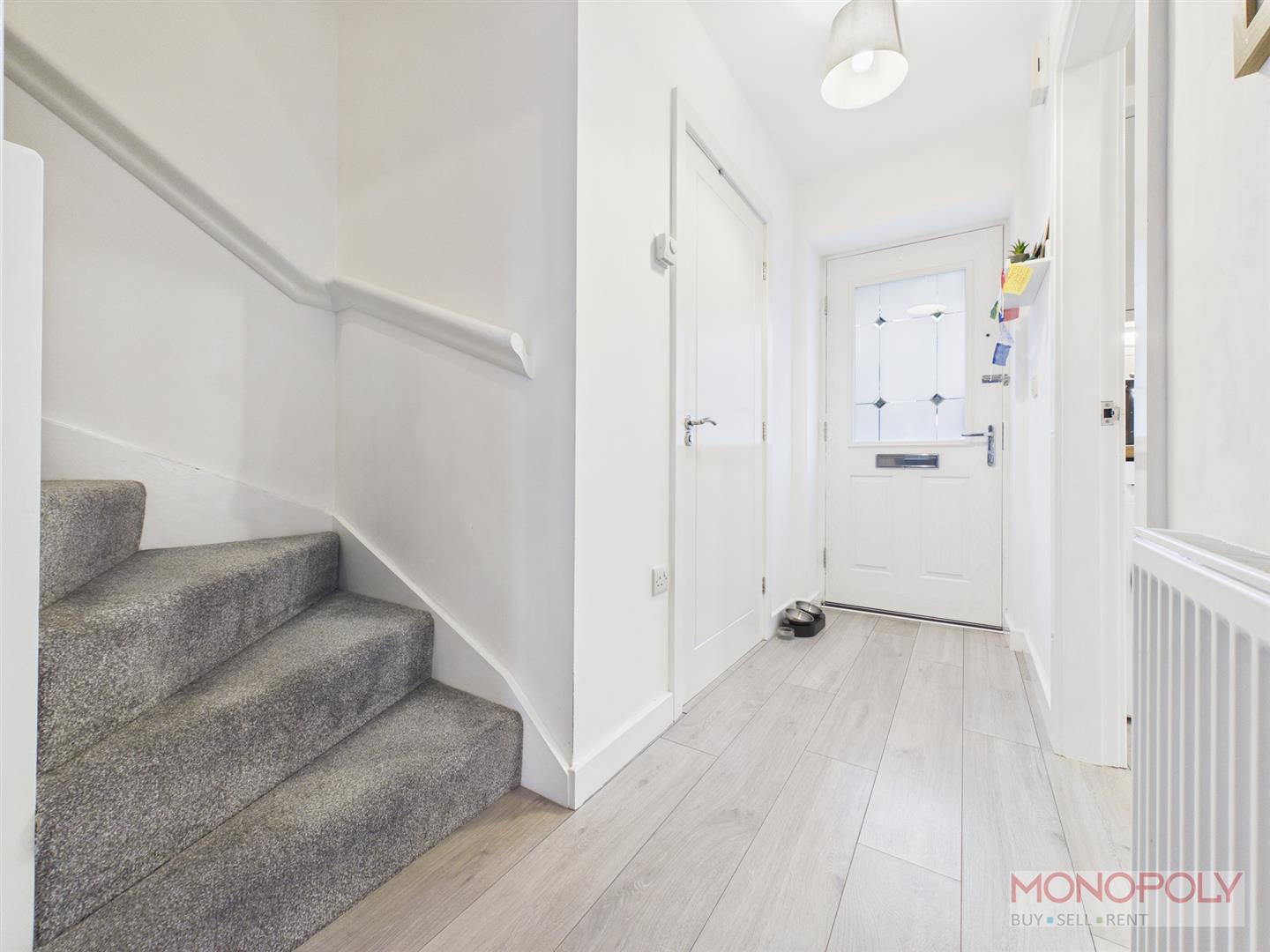 Composite door leading into entrance hallway with wooden laminate flooring, panelled radiator, ceiling light point, stairs rising to first floor, doors into downstairs WC, kitchen, and living/dining area.