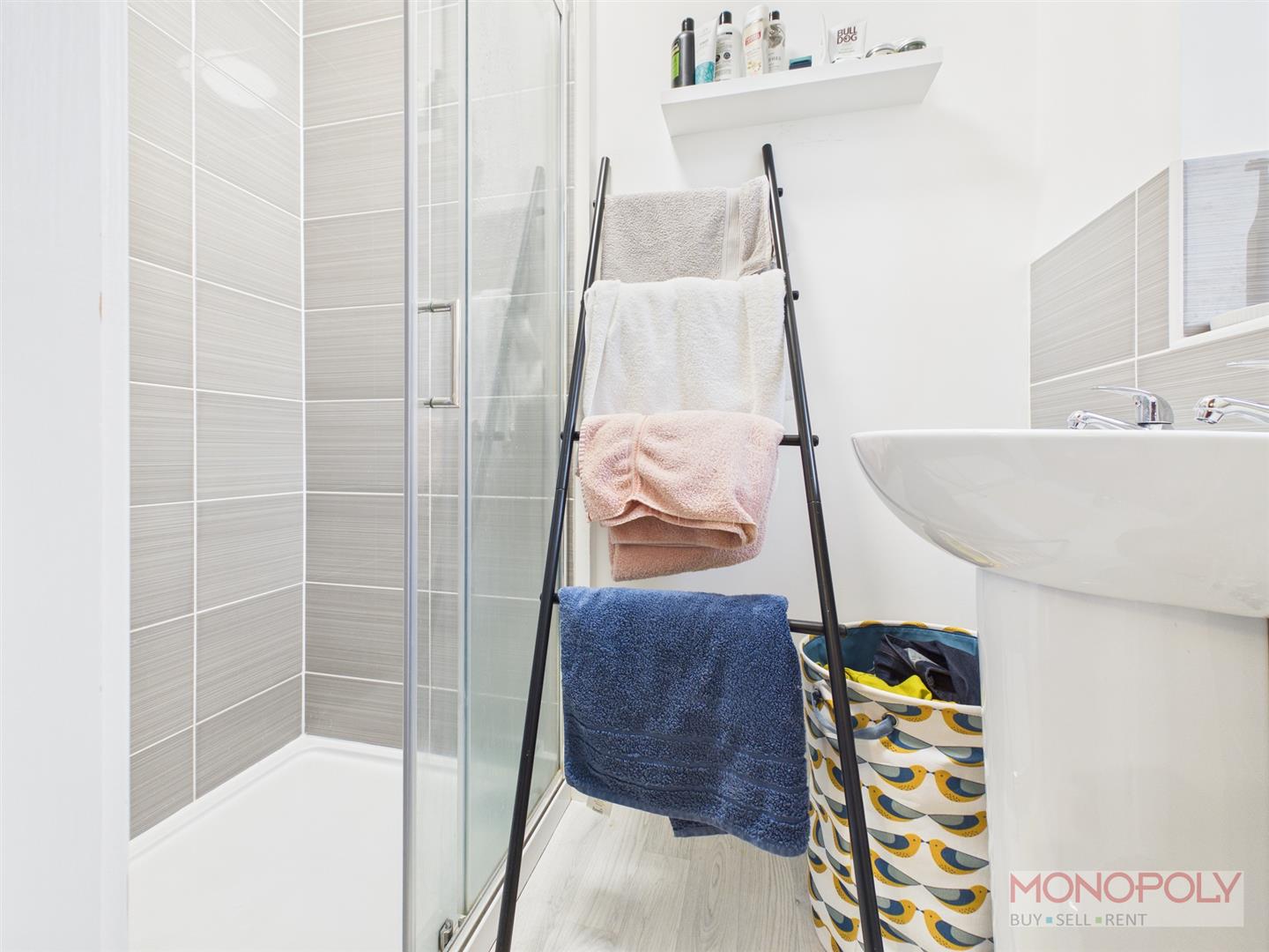 UPVC double glazed frosted window to the front elevation. Two piece suite comprising low level WC and wash hand basin set on vanity unit. Finished with modern vertical radiator, wooden laminate flooring and ceiling light point.
