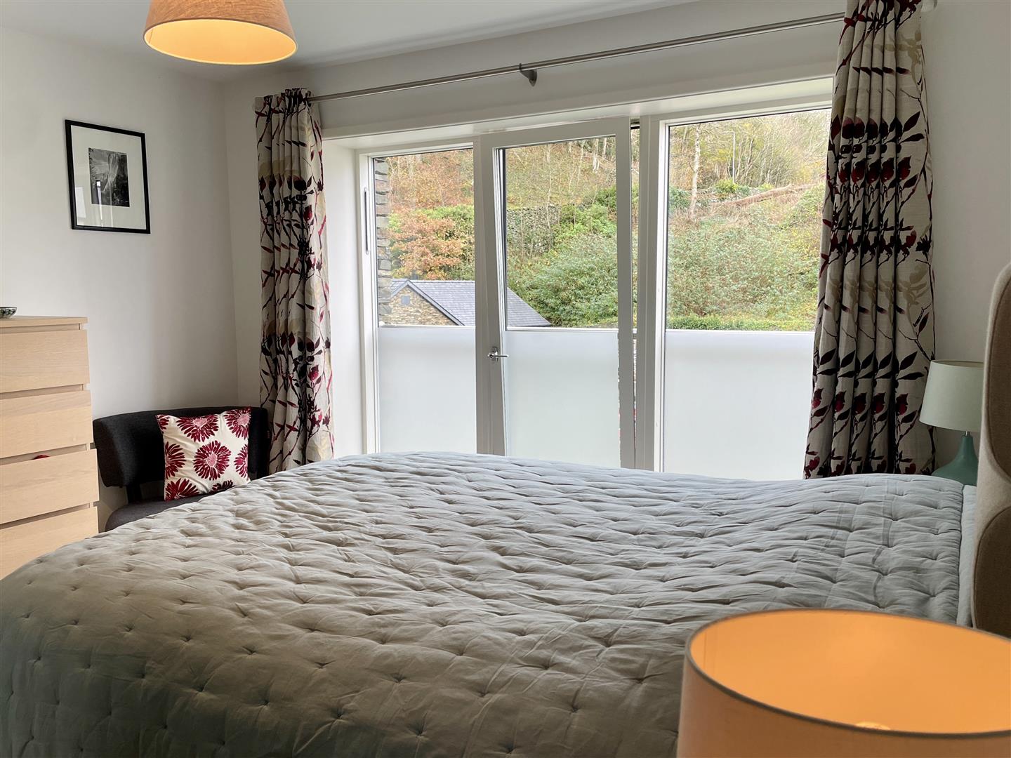 Lovely light double bedroom due to the glazed Juliet balcony door and glass balustrade with full length windows to each side overlooking the Walled Garden development to the beautiful woodland beyond.