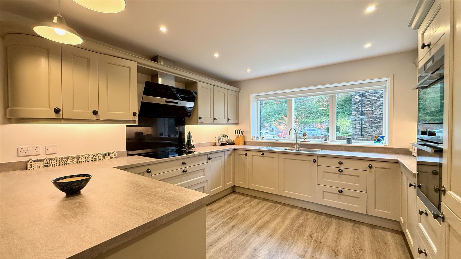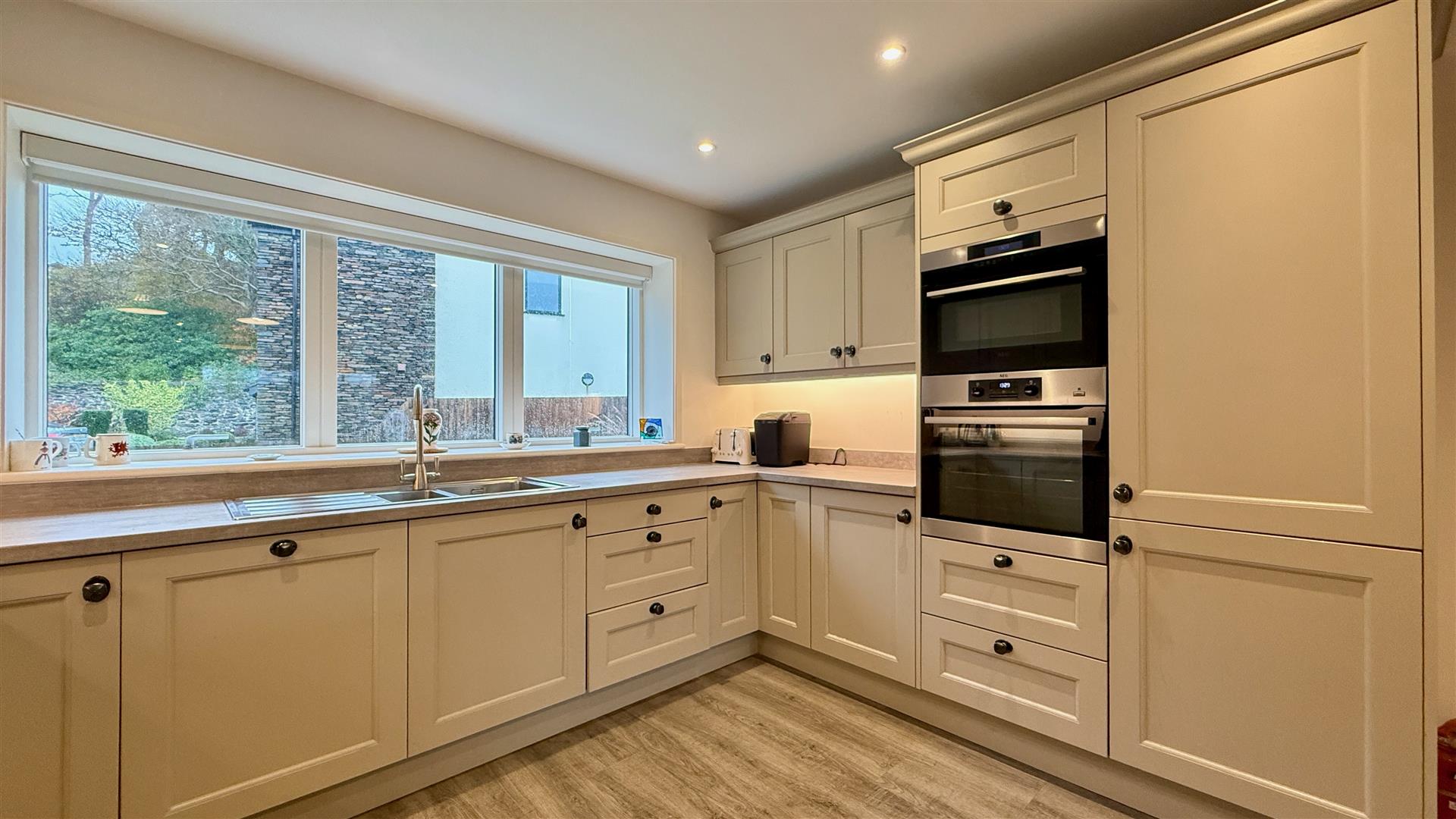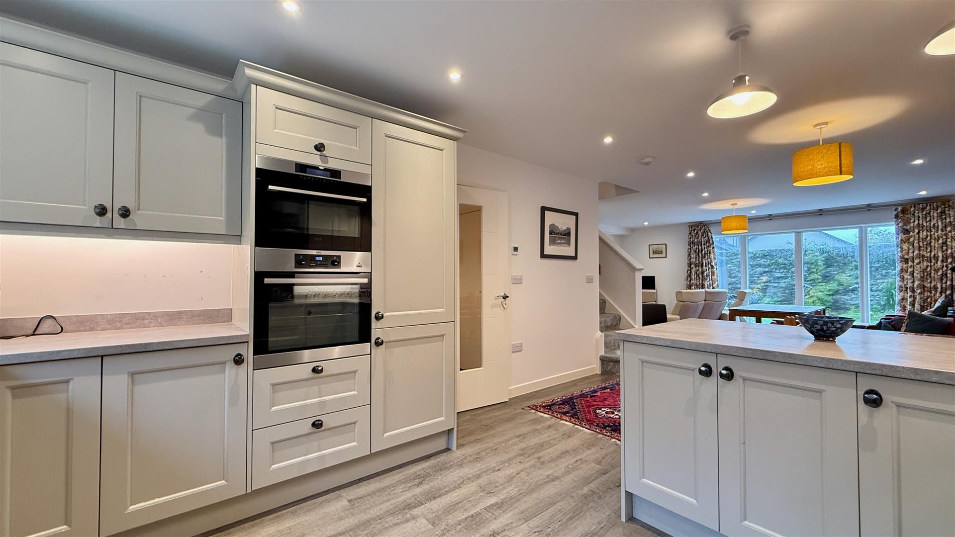 A delightful contemporary kitchen comprised of floor and wall units with integrated appliances including; fridge/freezer, AEG stainless oven, AEG microwave/grill, 5 plate AEG induction hob, AEG extractor and dishwasher. Recessed LED spotlights and breakfast bar and window to the front with remote control electric blind.