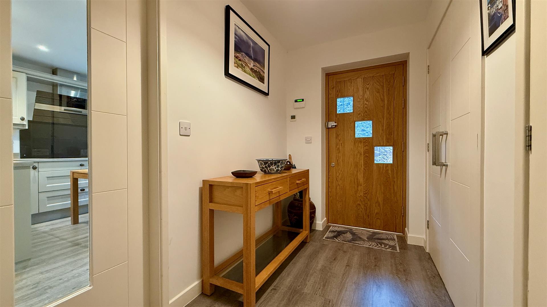 A part covered porch with large walk in lockable storage cupboard storage and boot/shoe seat leads to the front door which opens in to a large welcoming hallway with two large storage cupboards one of which contains the unvented pressurised hot water cylinder and storage space.