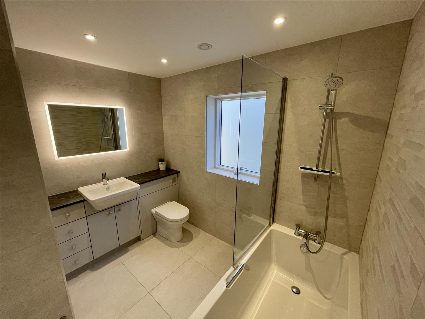 Stylishly appointed with white suite comprising of bath with shower and glazed screen over, low level WC, wash hand basin set in vanity unit and heated towel rail. Fully tiled walls and floor, underfloor heating and obscure glazed window to side elevation.
