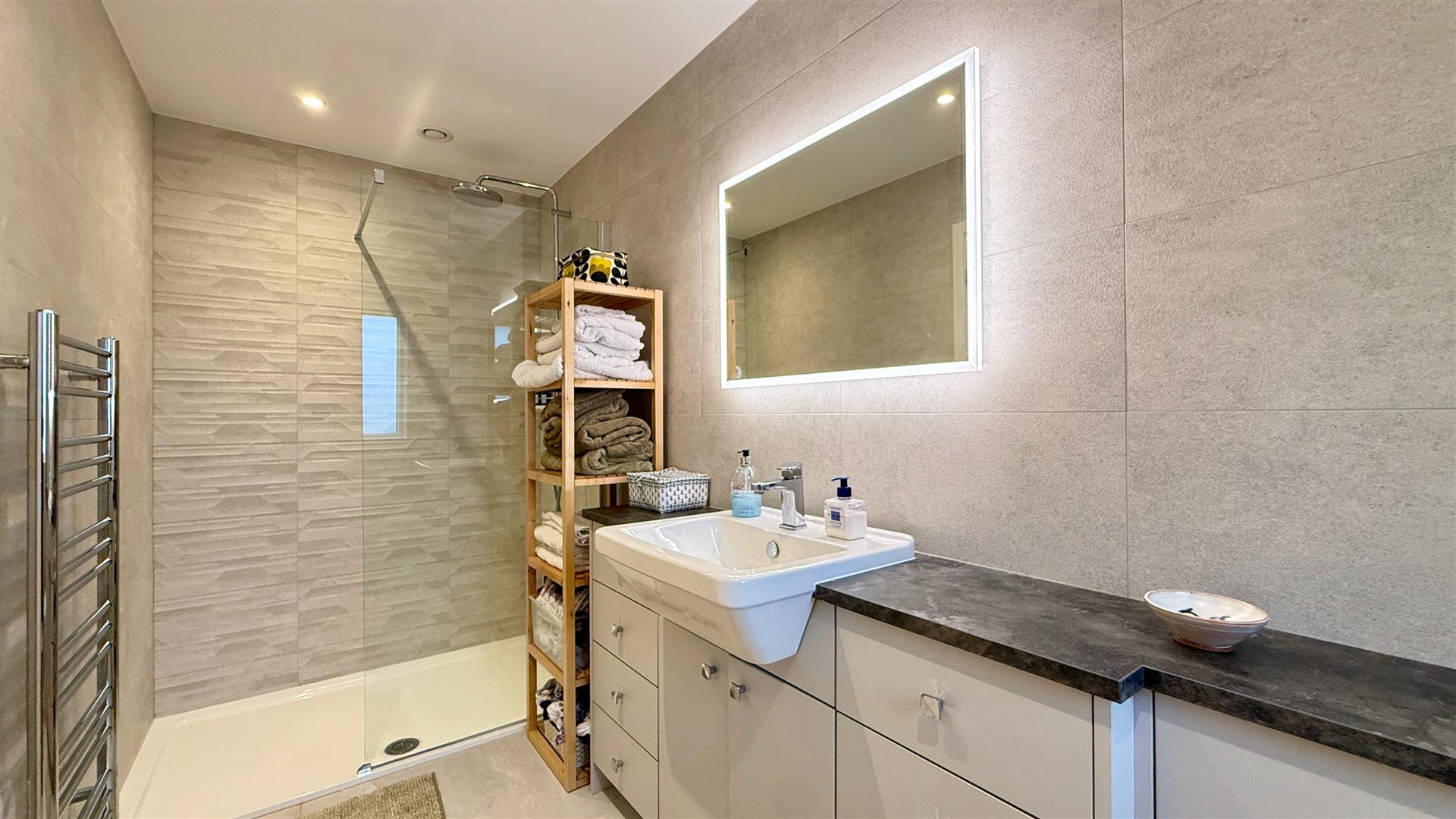 Contemporary and spacious with white suite comprising of walk in shower, low level WC, wash hand basin set in vanity unit and heated towel rail. Fully tiled walls and floor, underfloor heating and obscure glazed window to rear elevation.