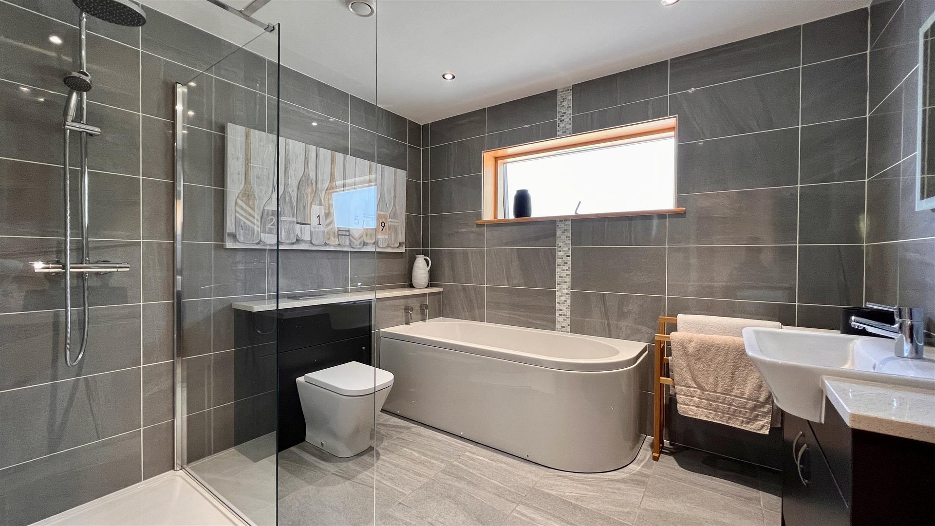 A very attractive spacious bathroom with low level WC, hand basin in vanity unit, bath and walk in shower. With fully tiled walls and floor with under floor heating, heated towel rail and window to the front.