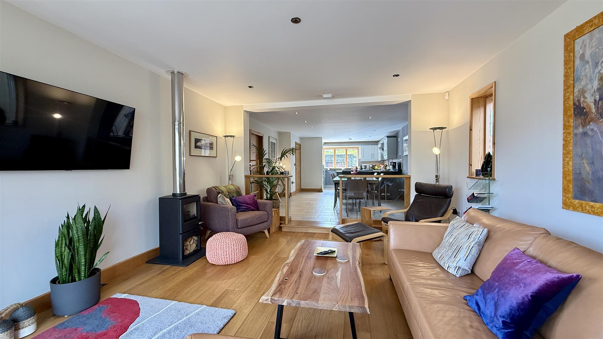 Extremely spacious and light with stunning views from the full height Velfac windows and doors spanning the width of the living room and an additional corner door opening to the patio and garden beyond. There is a cosy gas stove effect burner and engineered oak flooring.