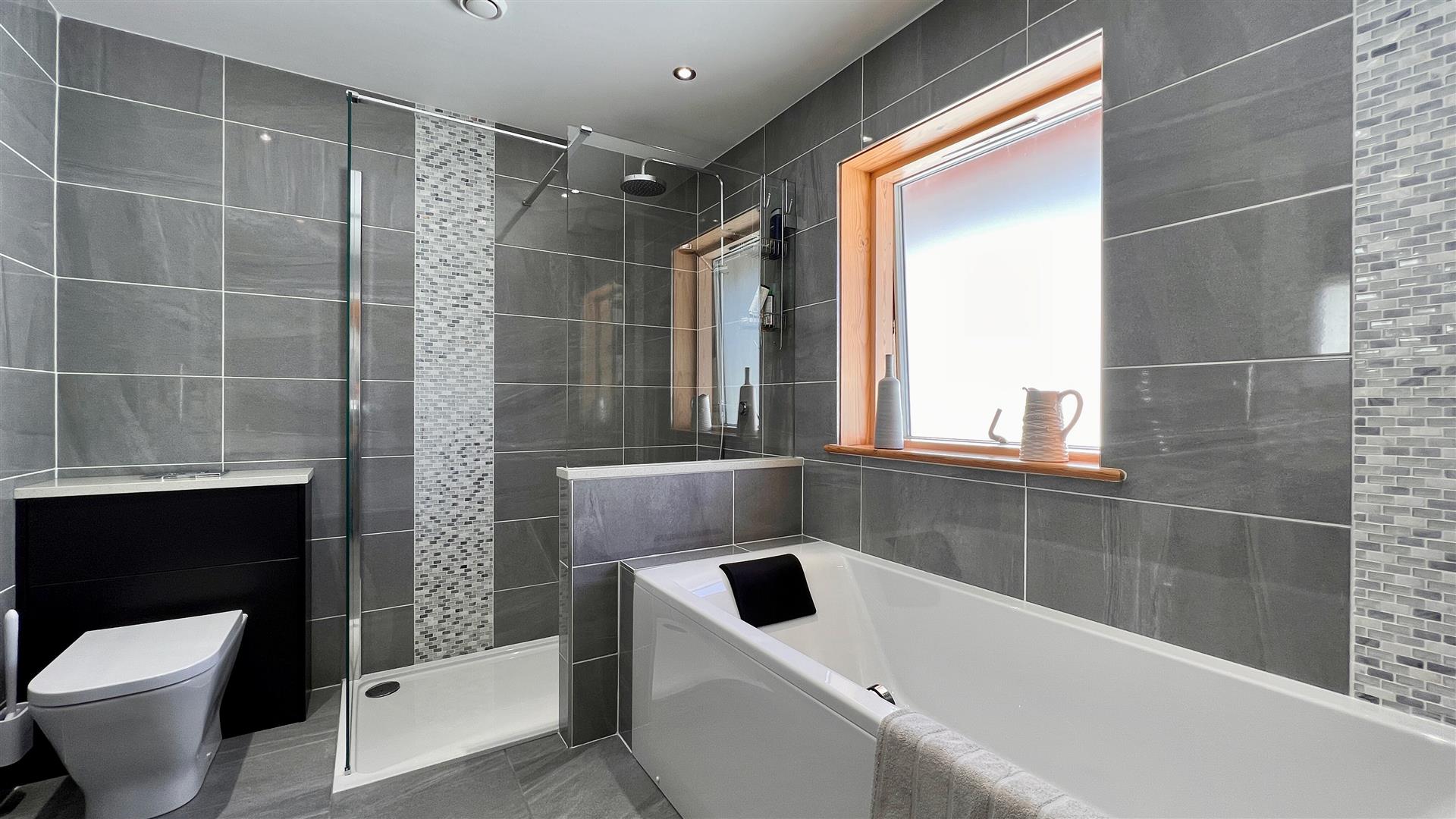 Beautifully appointed with low level WC, hand basin, bath and and large walk in shower. Fully tiled walls and floor with under floor heating, heated towel rail and window to the side.