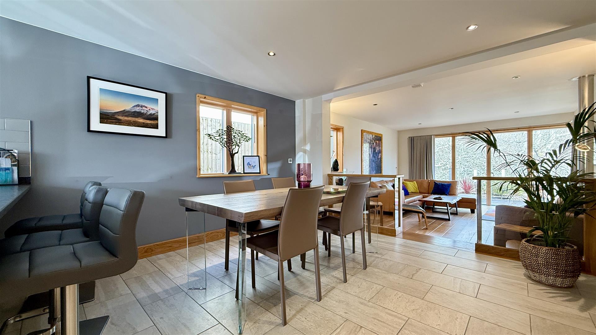 Open plan to the kitchen and living area, with a glass balcony above the living area and step down, there is ample space for a large dining table and chairs.