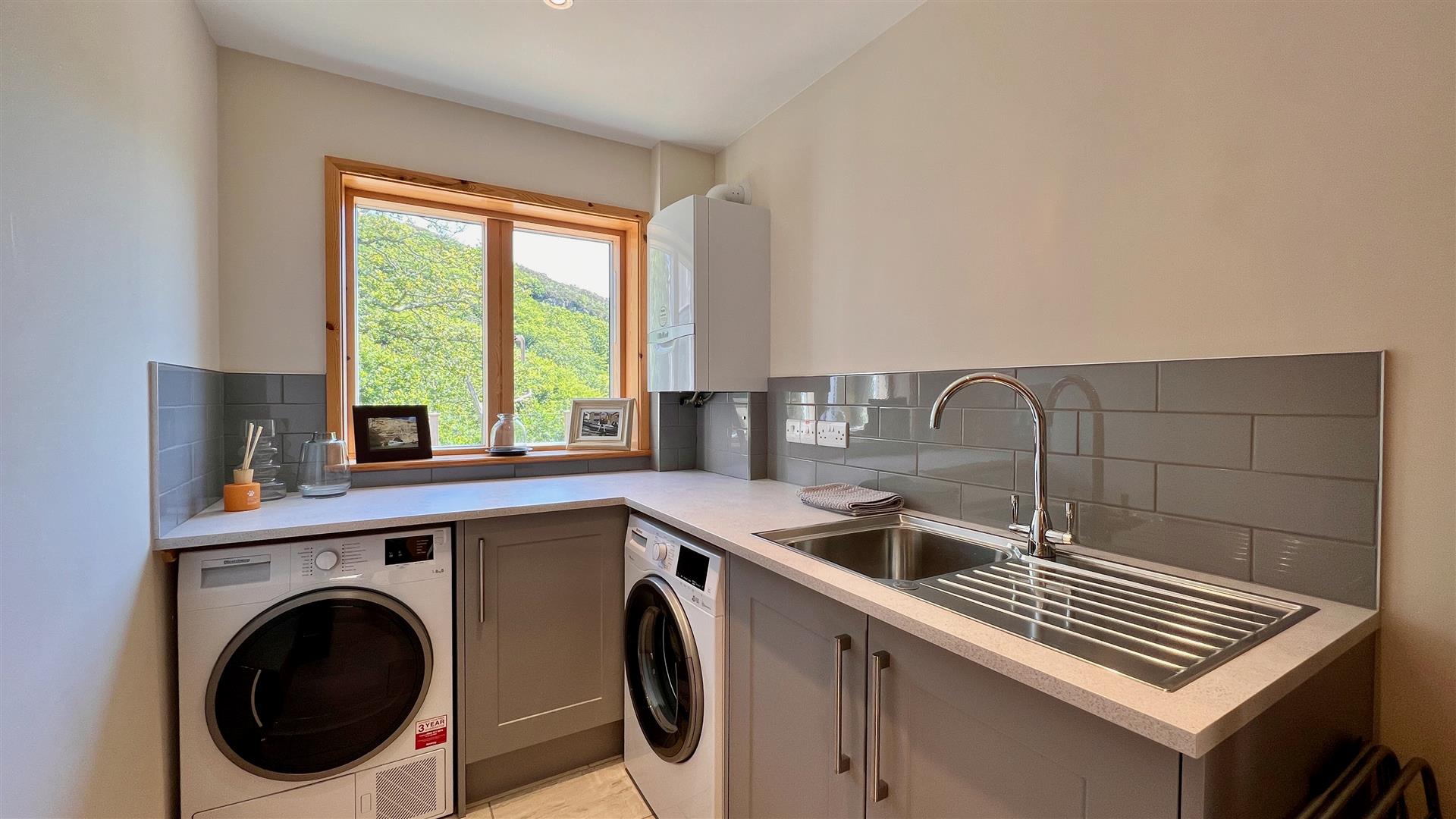 With space and plumbing for a washing machine and a tumble drier, a range of base units with a counter and sink over. Window to the garden.