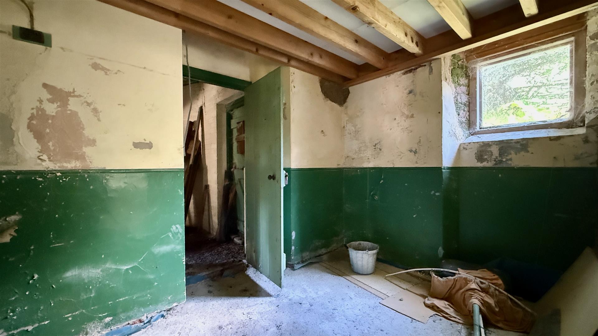Newly created space adjacent to open plan living area with door to rear room and window to side.