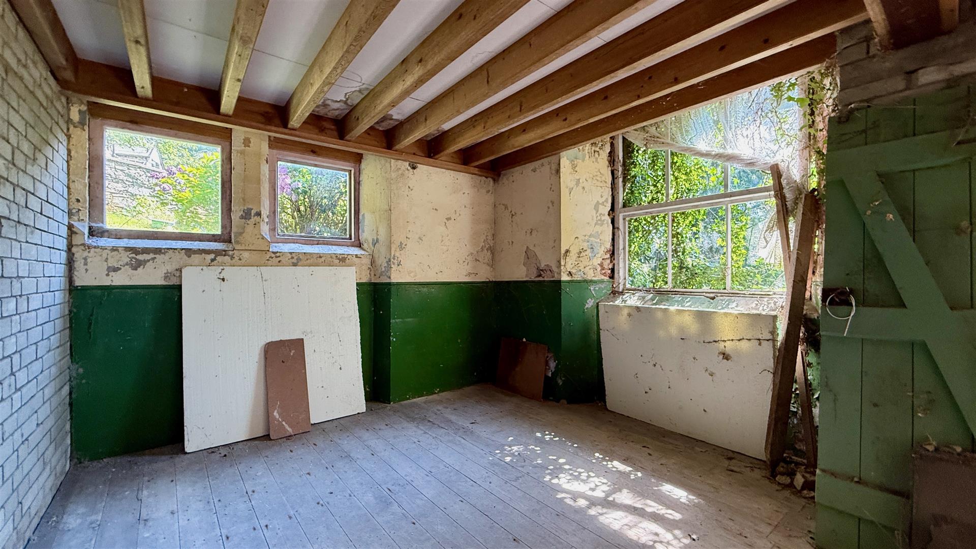 Solid wall construction with mixed roof construction, two doors to gardens and window to side garden.