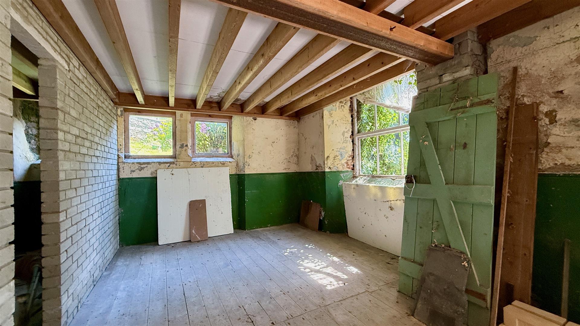 To the right is a natural dining area with dual aspect windows and there is newly installed dividing wall to create a kitchen adjacent.
