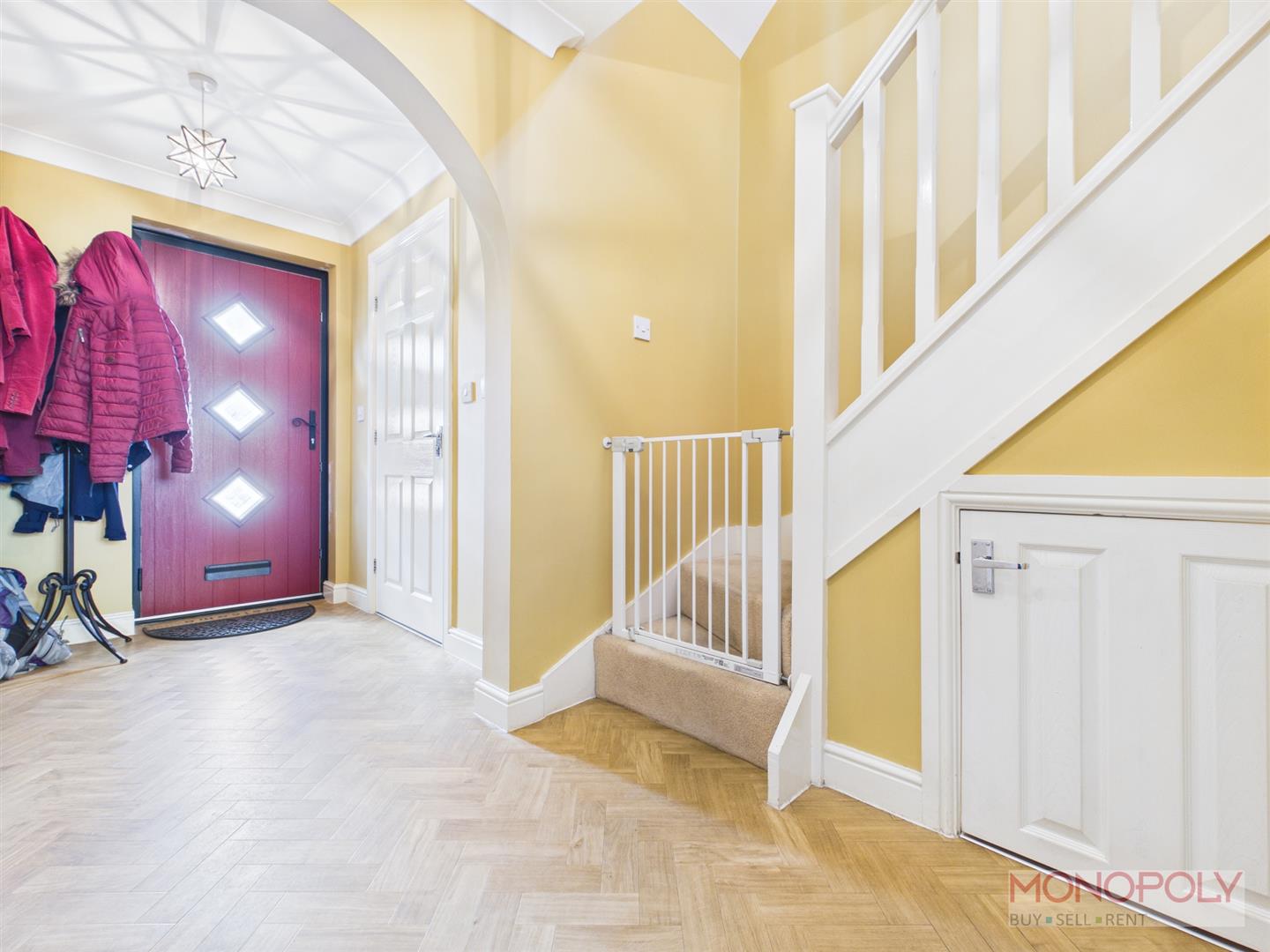 In brief, the ground floor comprises an entrance hallway, living room featuring a cosy fireplace, dining room, a well-appointed kitchen, utility room and a downstairs WC. To the first floor, the landing provides access to four bedrooms and two bathrooms, offering flexibility for growing families or those working from home.