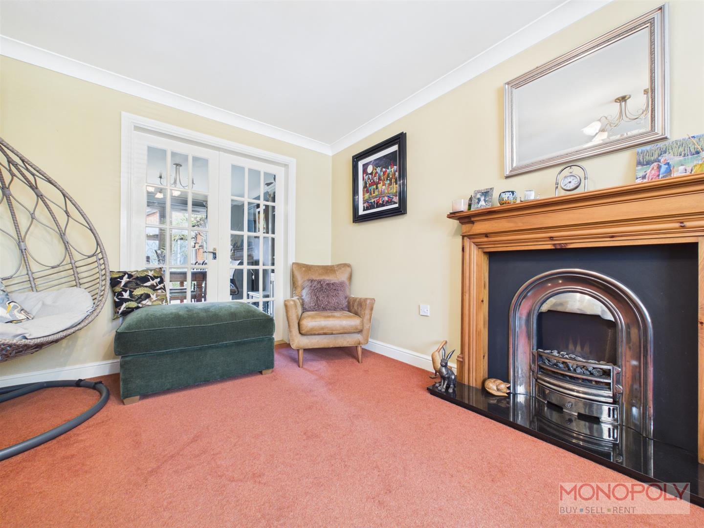 UPVC double glazed window to front, electric fire with complementary surround, carpet flooring, ceiling light point, panelled radiator and glazed wooden double doors to dining room.