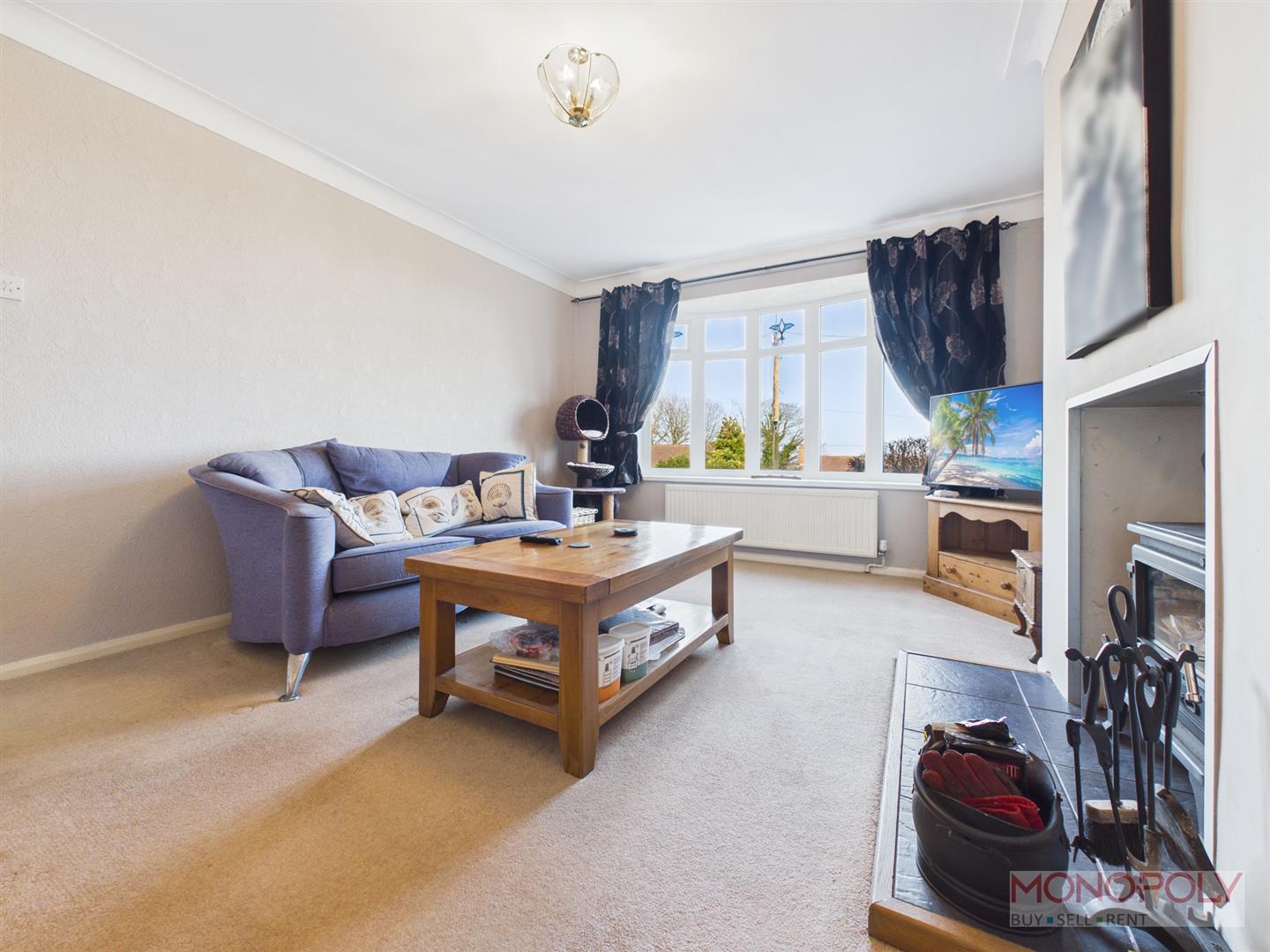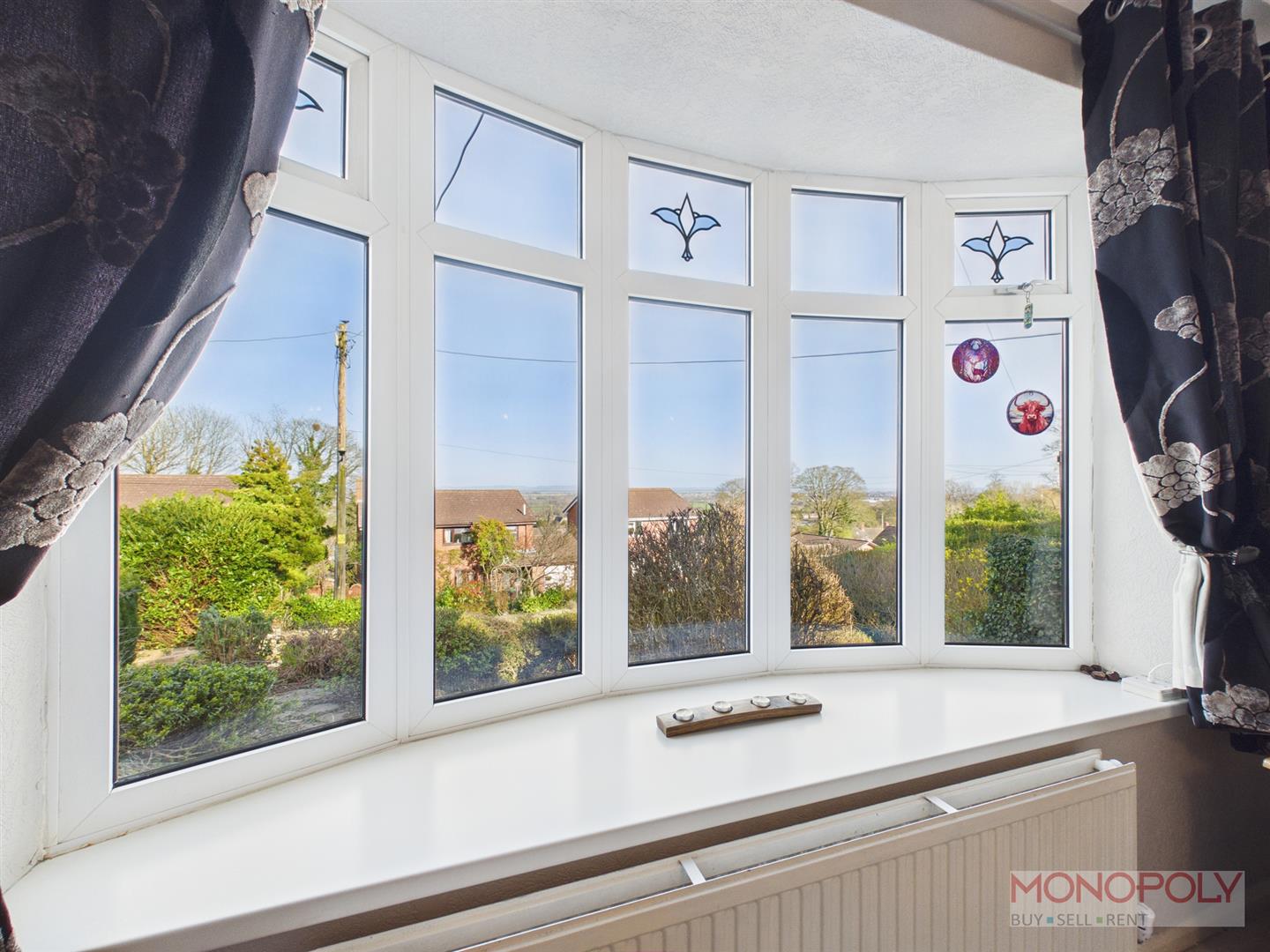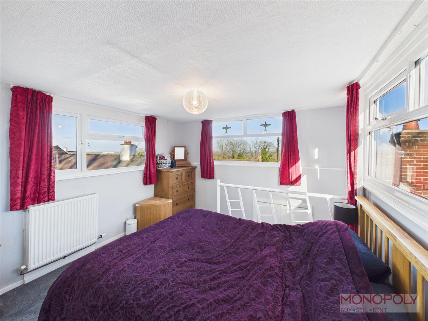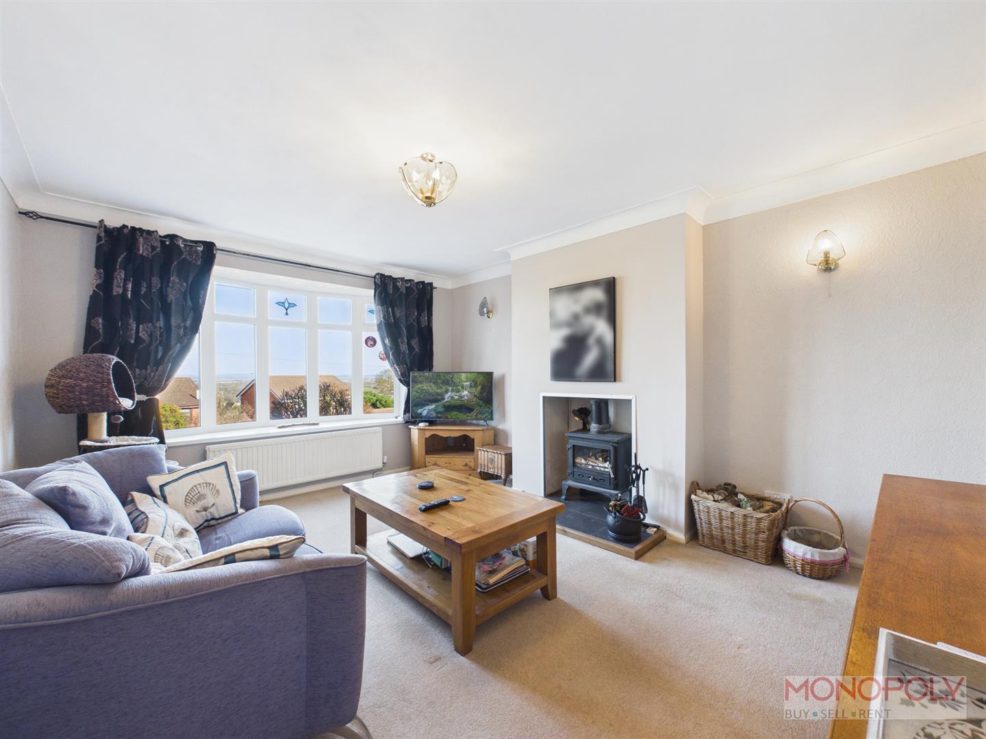 UPVC double glazed bay window to the front elevation with excellent views. Multi-fuel burner set on a slate hearth, carpet flooring, ceiling light point, two wall lights, panelled radiator and door to bedroom one.
