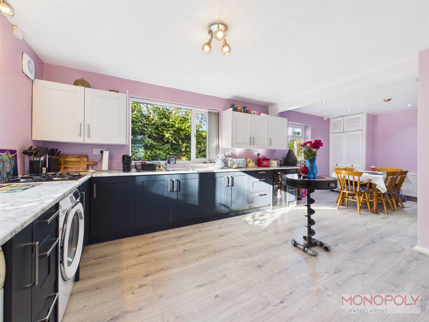 Housing a range of wall, drawer and base units with complimentary work surface over, incorporating a 1.5 stainless steel sink unit with mixer tap. Integrated appliances include eye-level double oven and grill and four ring gas hob. Space and plumbing for washing machine, space for further appliances including fridge-freezer, wine fridge, and tumble dryer. Storage cloakroom cupboard, wooden laminate flooring, two ceiling light points, two uPVC double glazed windows to the side and rear along with glazed wooden doors into the conservatory. Opening into the dining area which has an additional uPVC double glazed window to the side, ample space for dining table, cupboard housing boiler, continuation of wooden laminate flooring, recessed LED lighting and panelled radiator.
