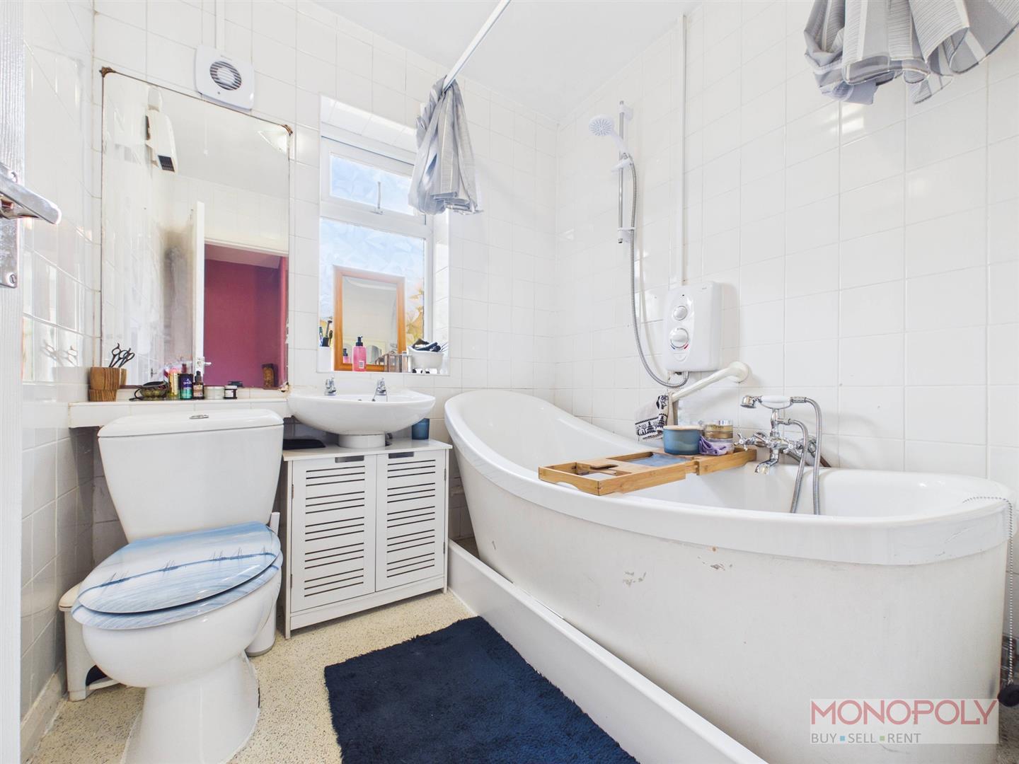 Three piece suite comprising low-level WC, pedestal wash hand basin and freestanding bath with newly fitted electric shower over. Finished with non-slip vinyl flooring, tiled walls, panelled radiator with towel rail, extractor, electric wall heater, ceiling light point and uPVC double glazed frosted window to the side elevation.