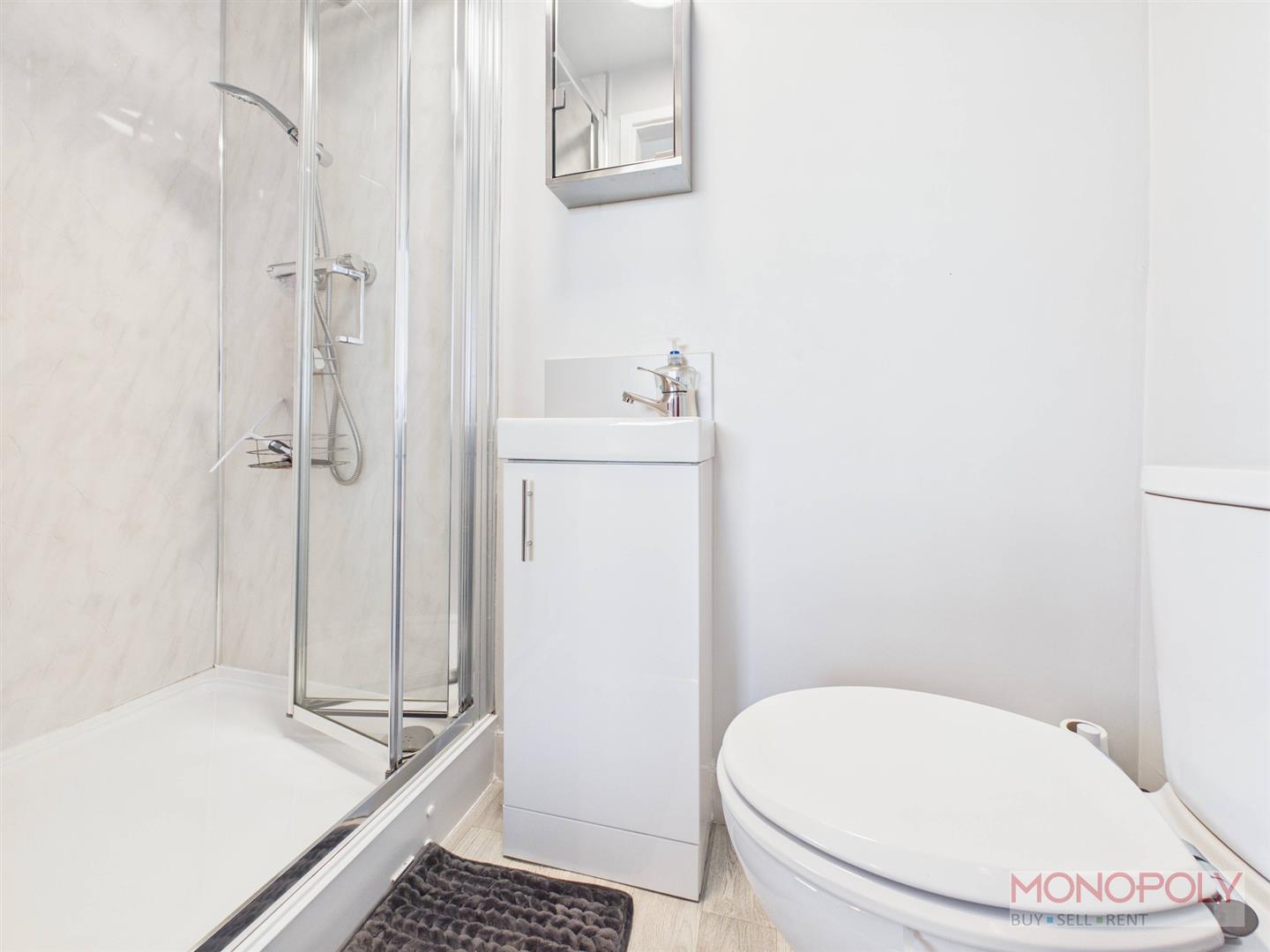 Three piece suite comprising low-level WC, wash hand basin with storage under and enclosed mains shower cubical. Finished with chrome heated towel rail, ceiling light point, extractor and wood effect flooring.