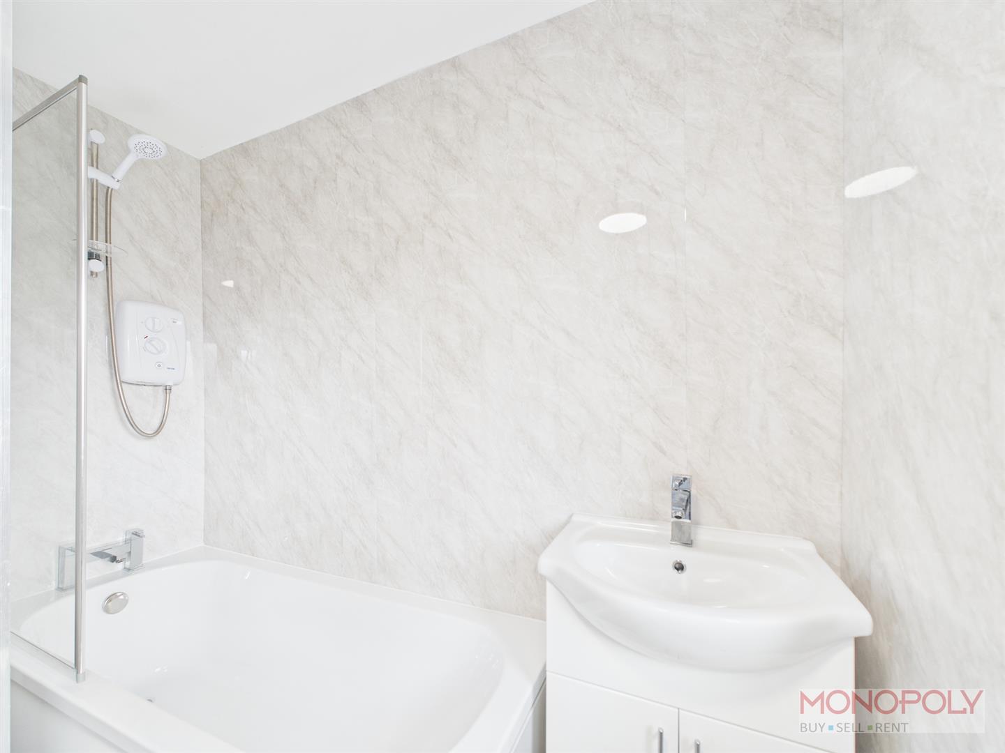 Comprising of a panel enclosed bath with shower over, wash hand basin set in a vanity unit, radiator, tiled floor, Three UPVC Double glazed and frosted windows to the rear, low level w.c., extractor fan