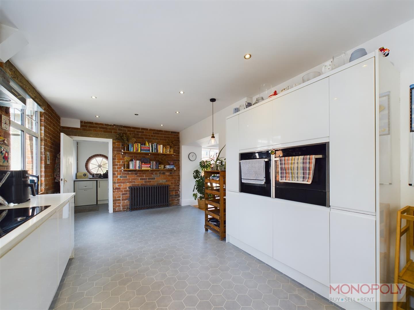 A modern, superbly appointed kitchen fitted with a comprehensive range of white gloss wall, drawer and base units, Quartz working surface with inset 1 1/4 sink and drainer, double electric oven (owner informs us that the element has gone on one of the ovens), 5 ring induction hob, integrated dishwasher, stainless steel splash back, extractor fan, part tiled walls, exposed brick wall, cast iron radiator, 3 double glazed windows.