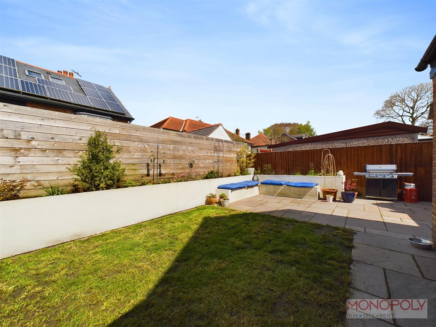 The rear garden is well maintained with an Indian stone patio leading onto a lawned garden with raised flower beds and built in concrete seating. There is also a separate gated child friendly area laid with bark.