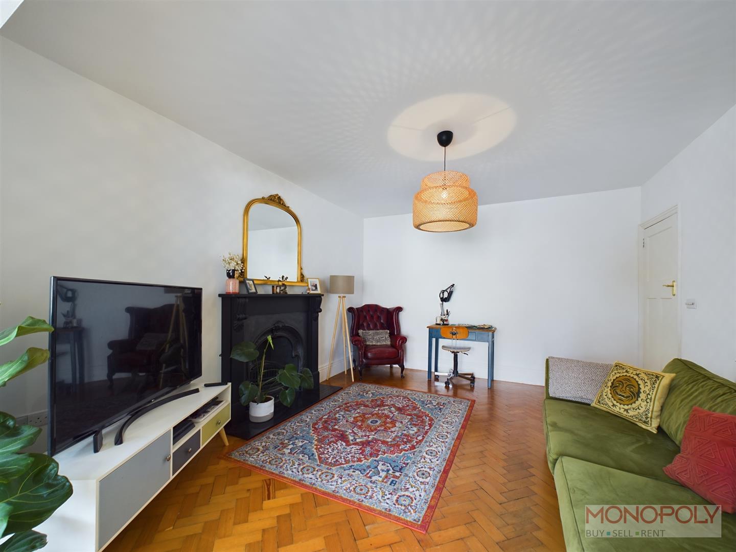 A beautifully presented room with a lagre double glazed bay window to the front with fitted plantation blinds, Attractive central fireplace with slate stone hearth and ornate mantel, parquet flooring.