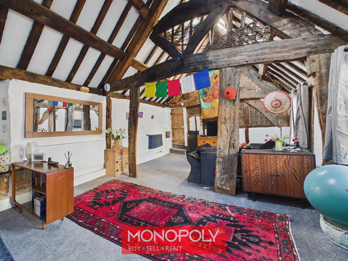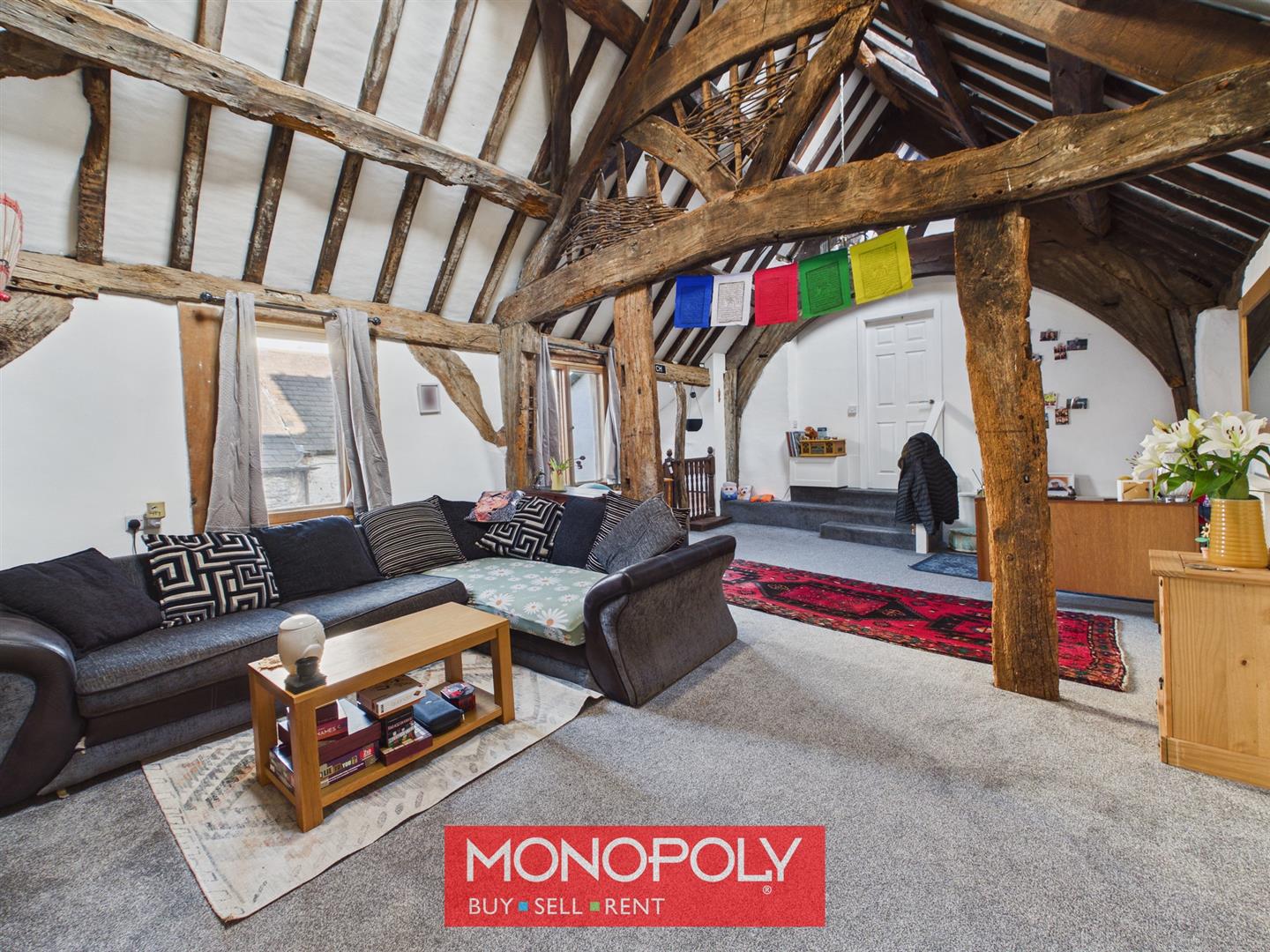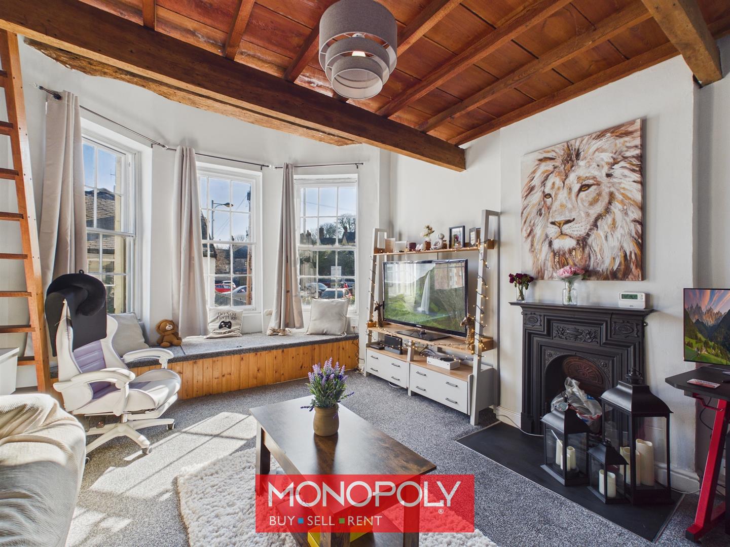 A spacious and highly characterful lounge with carpeted flooring and an impressive original roof structure that creates a striking focal point. The room features a decorative wrought-iron fireplace, radiator, and a charming bay window with x3 12-pane horned sashes (with secondary glazing) and window seat with storage beneath. Wooden loft stairs lead you up to the mezzanine.
