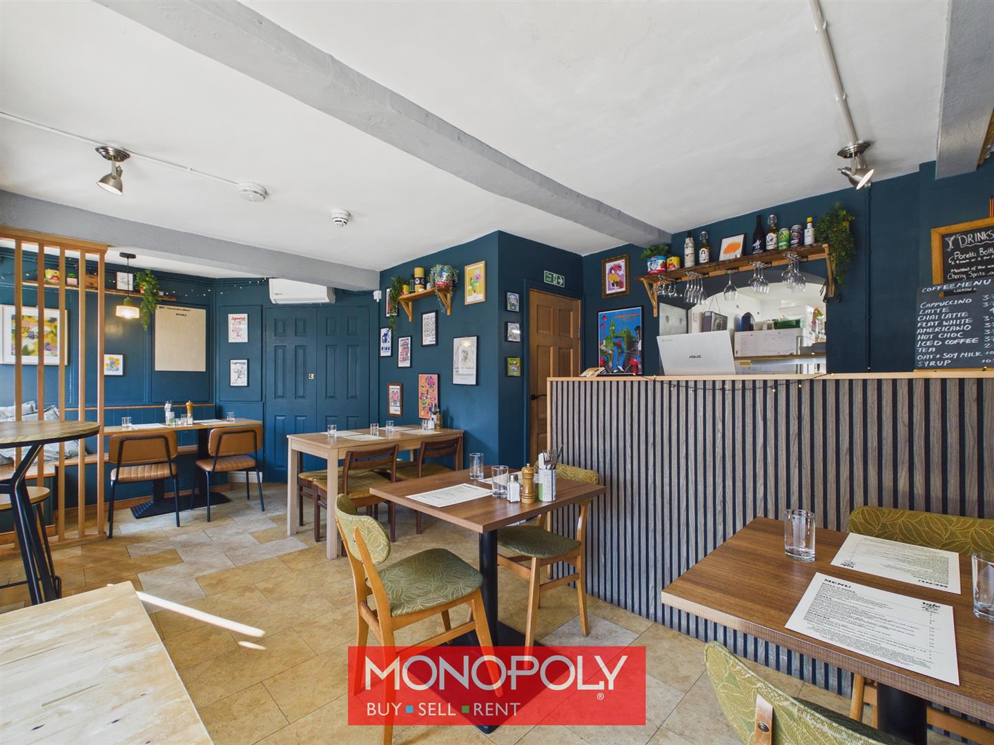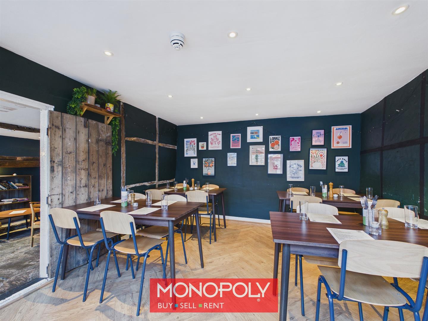 The second room offers a larger, more formal restaurant space, beautifully blending rustic features with a contemporary finish, including exposed wall timbers, herringbone-effect flooring and ample room for multiple dining tables, making it both practical and visually appealing for customer service.