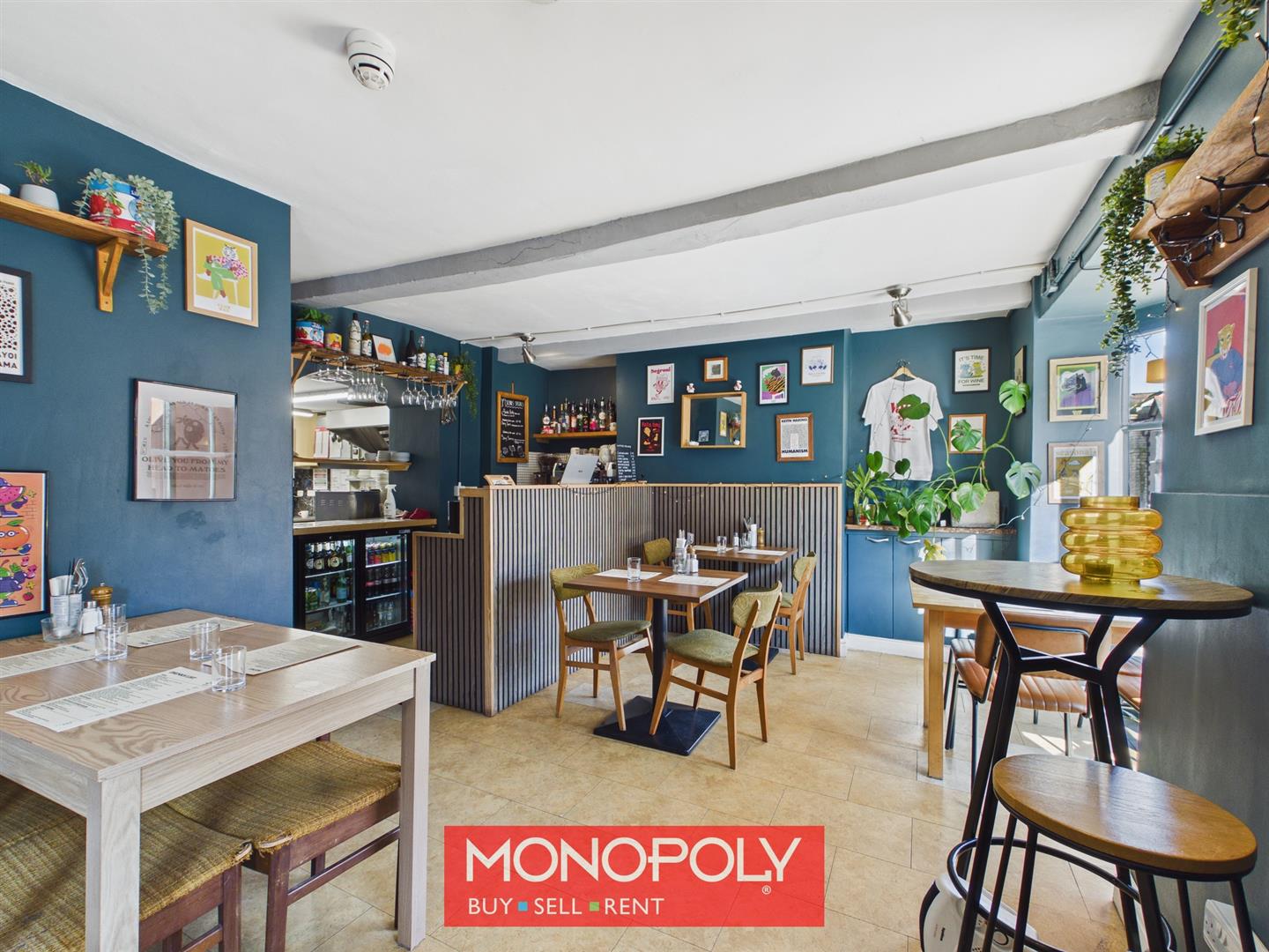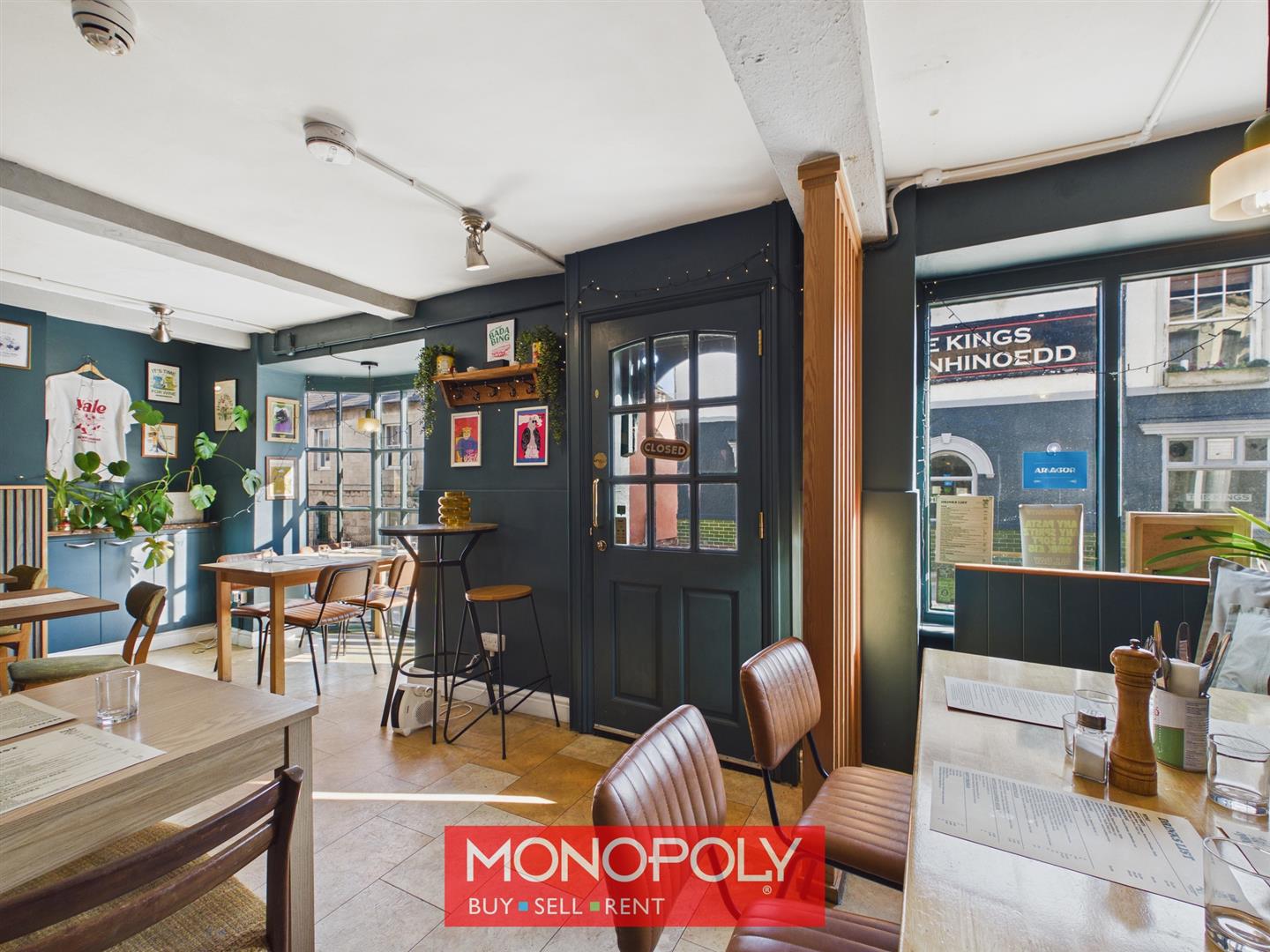The main restaurant benefits from an attractive shop front with bay window, an additional front window and doors to the front, creating a bright and prominent frontage. Finished with laminate flooring, the room also includes a bar area and a door to the rear, offering a flexible commercial-style layout.