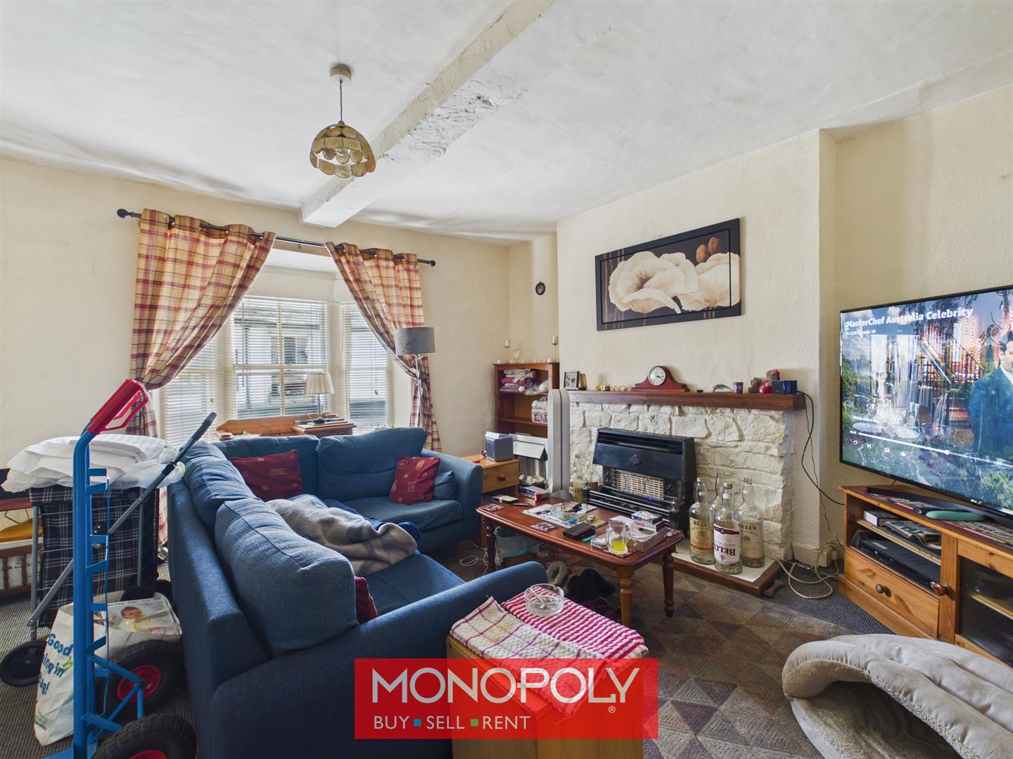 Generous carpeted living area with central fireplace housing a caped gas fire, painted beam and a bay window overlooking the front of the property, with built-in storage cupboard and door leading into the kitchen.